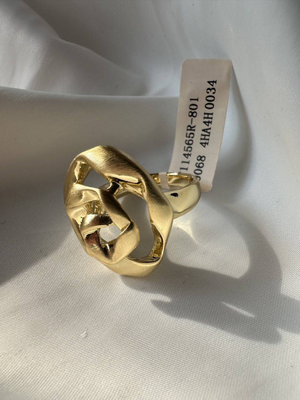Современное кольцо с уникальной абстрактной формой, выполненное в матовом золотистом цвете. Объемная структура и плавные изгибы создают эффектный и стильный образ. Это украшение станет ярким акцентом вашего образа.