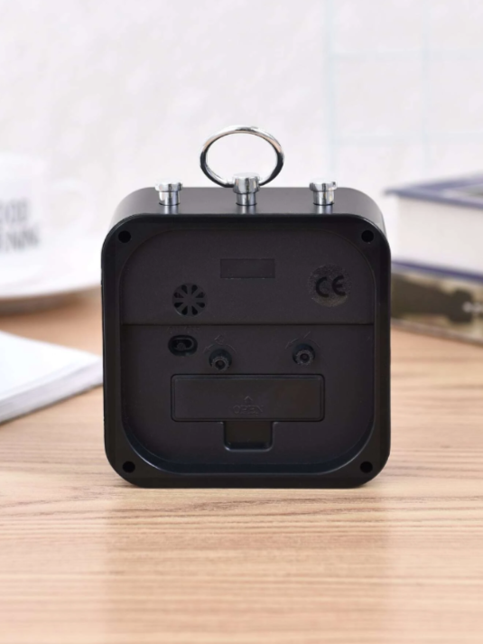 Будильник оснащен кварцевым механизмом, гарантирующим точность хода. На верхней части корпуса расположены кнопки управления и металлическая петля, добавляющая ретро-стиль в дизайн. Задняя панель содержит элементы настройки времени и будильника, а также отсек для батареек.