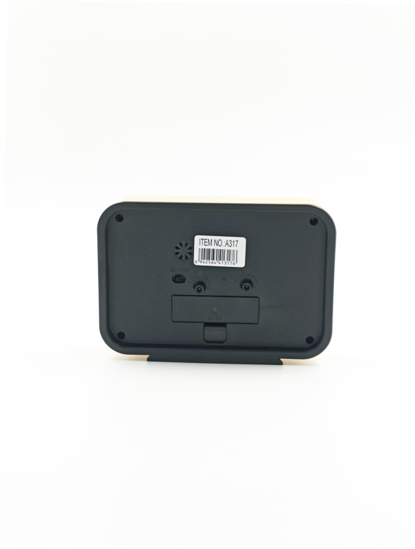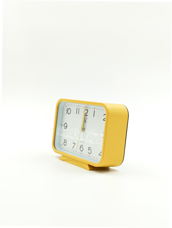 Этот будильник выполнен в современном минималистичном дизайне с прямоугольным корпусом и закругленными краями. Он имеет ярко-желтую пластиковую рамку, что делает его стильным и заметным элементом интерьера. Циферблат белого цвета с четкими черными арабскими цифрами, что обеспечивает удобство считывания времени.
