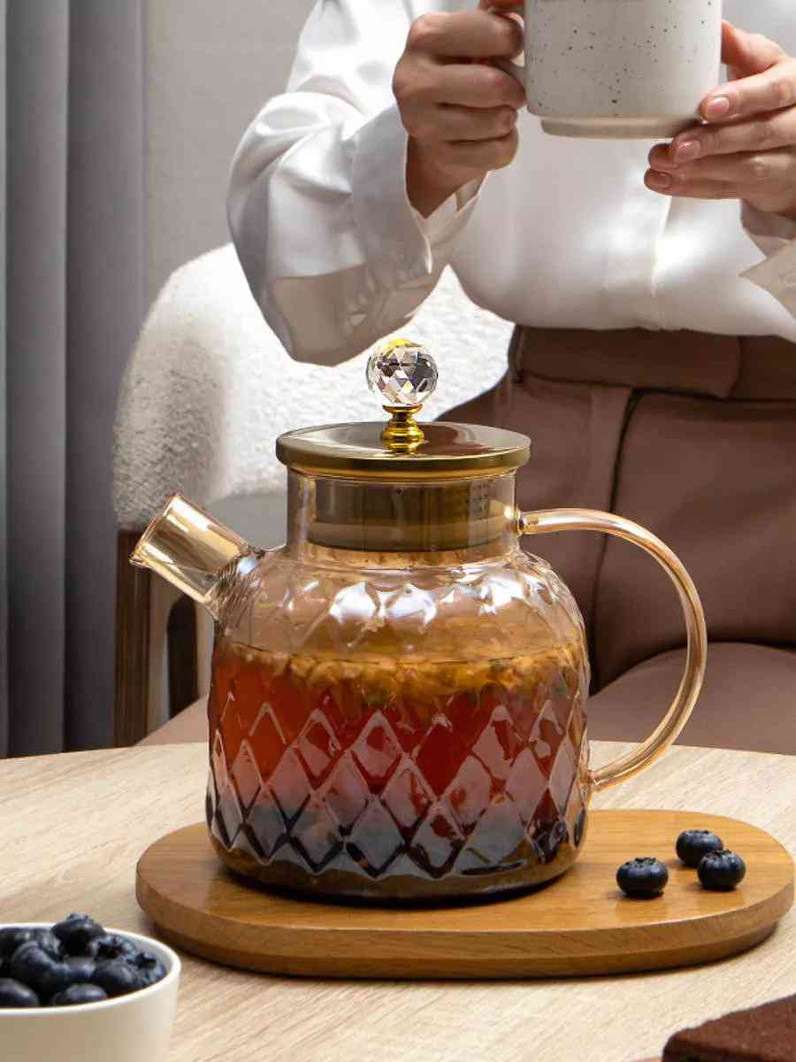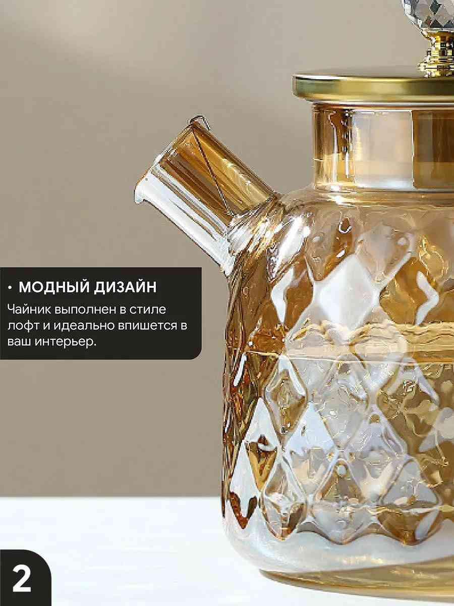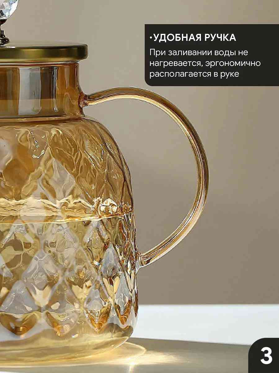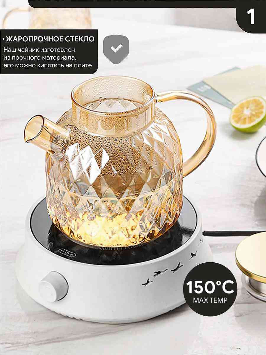 Универсальный чайник из плотного термостойкого стекла объёмом 1800 мл. Подходит для использования на газовой плите и мытья в посудомоечной машине. Герметичная крышка плотно фиксируется благодаря силиконовому ободку. Фактурный корпус с алмазным узором придаёт чайнику декоративность и статусность.