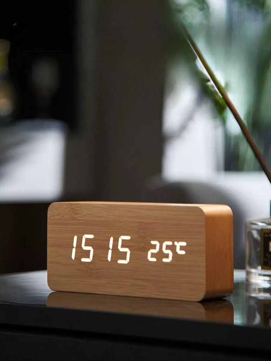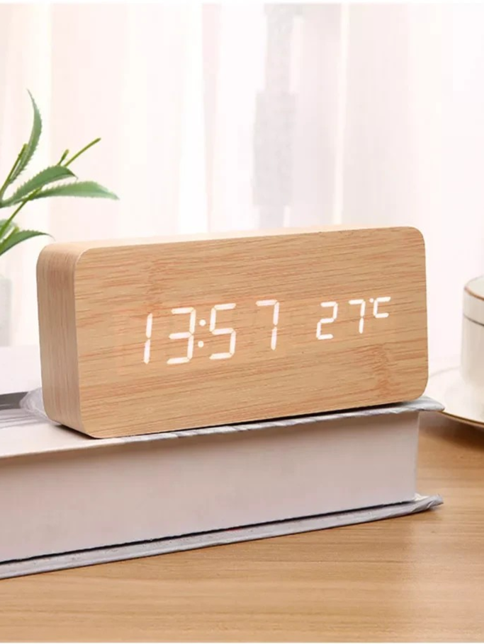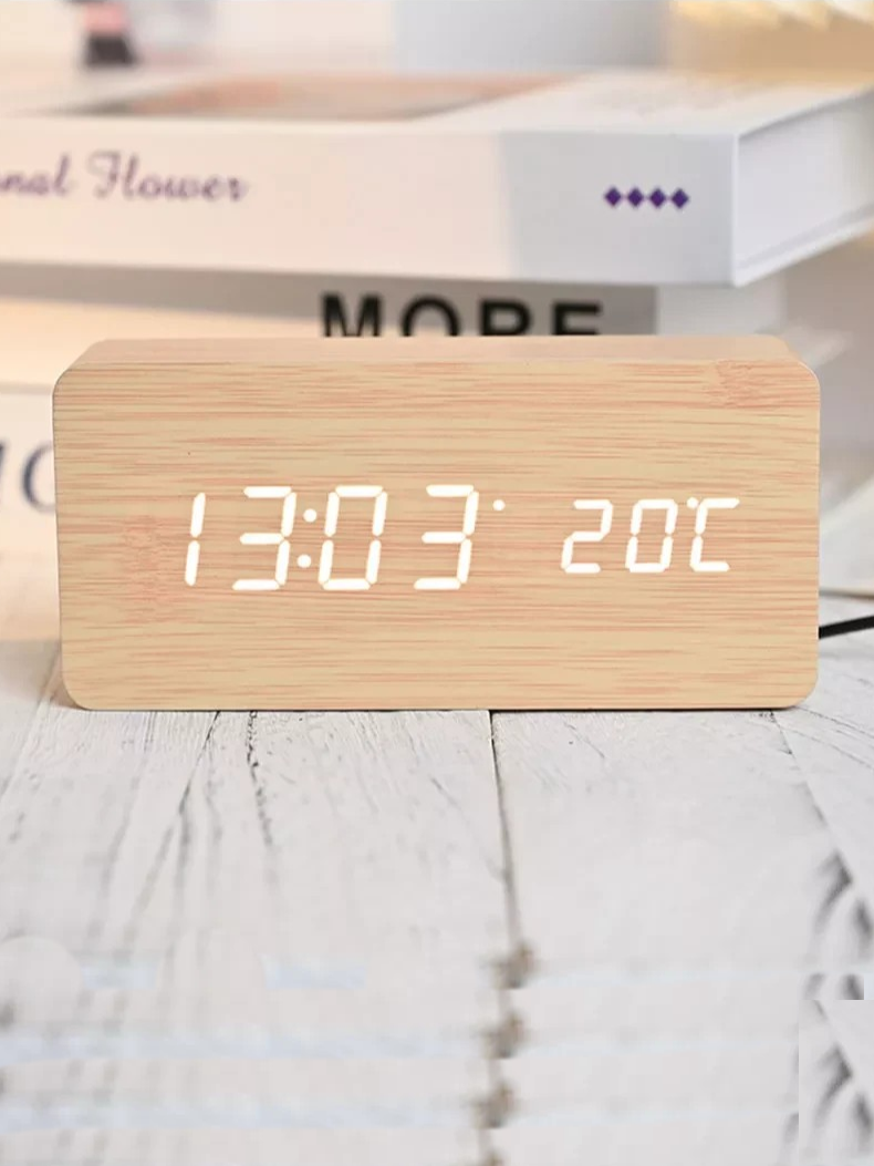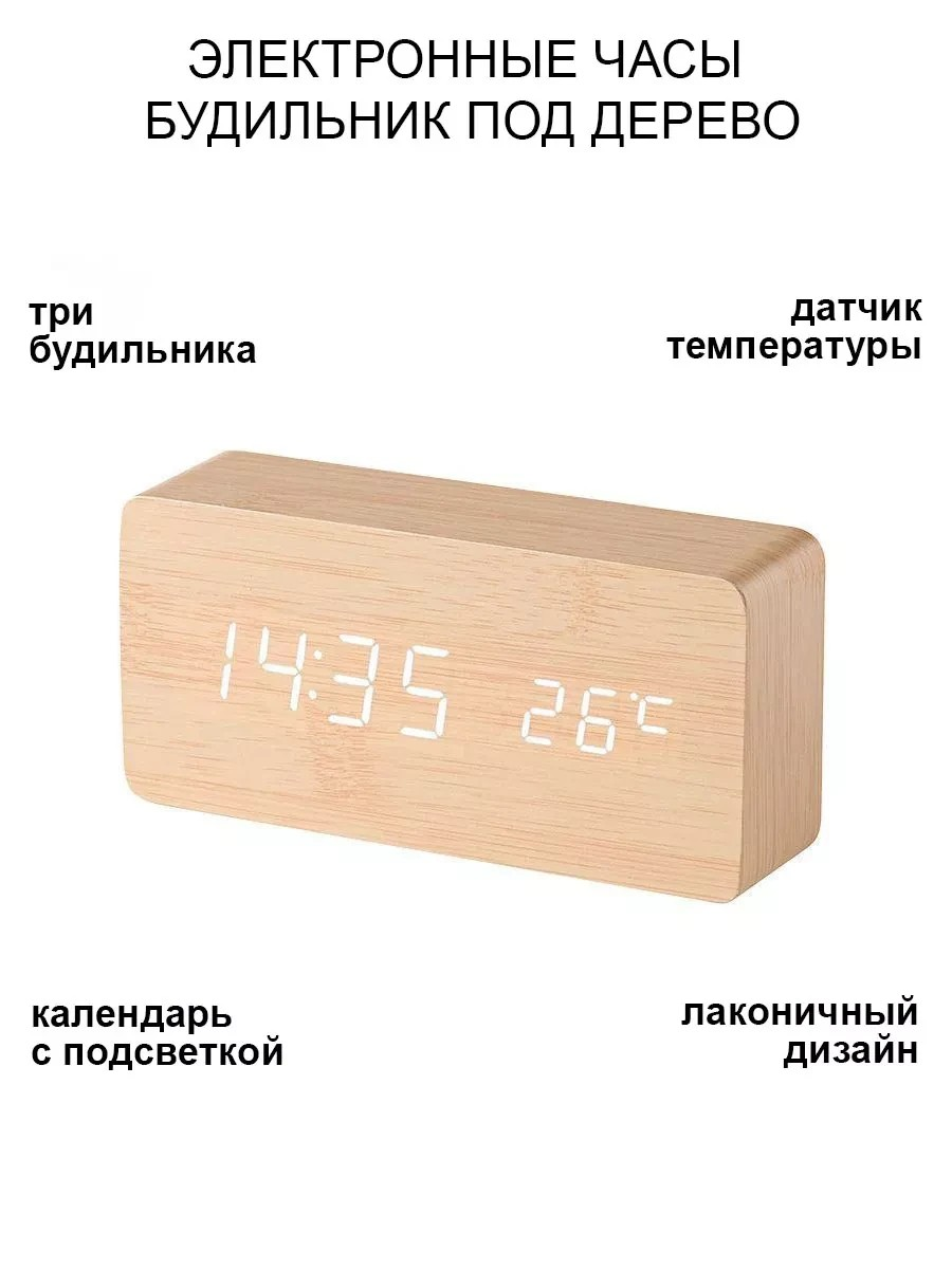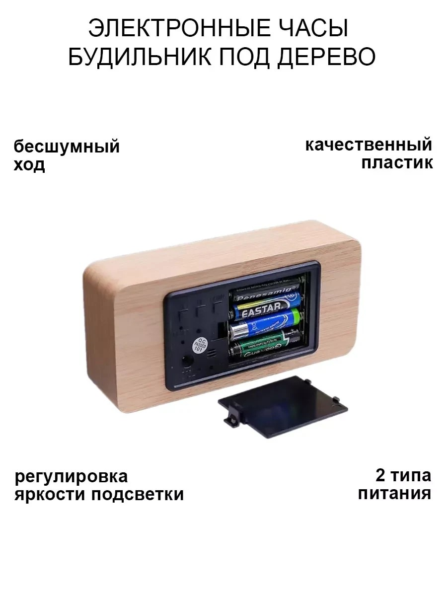 Часы выполнены в виде деревянного бруска (корпус изготовлен из пластика и покрыт пленкой под дерево различных пород). Выглядят очень натурально и могут быть подобранны под любую мебель и обстановку. Экран со светодиодной яркой красивой подсветкой цифр, и отображением времени, даты, температуры. Встроенный будильник на три времени звонка (три звуковых сигнала звучат в течение одной минуты). Понижение яркости на 1/2 c 18:00 до 7:00. Возможность переключения с 12-ти на 24-ти часовой режим. Отображение температуры в градусах Цельсия или Фаренгейта. Питание: USB или ААА батареи (в комплект не входят). Часы не cбрacывaютcя при отключении внешнего питания.