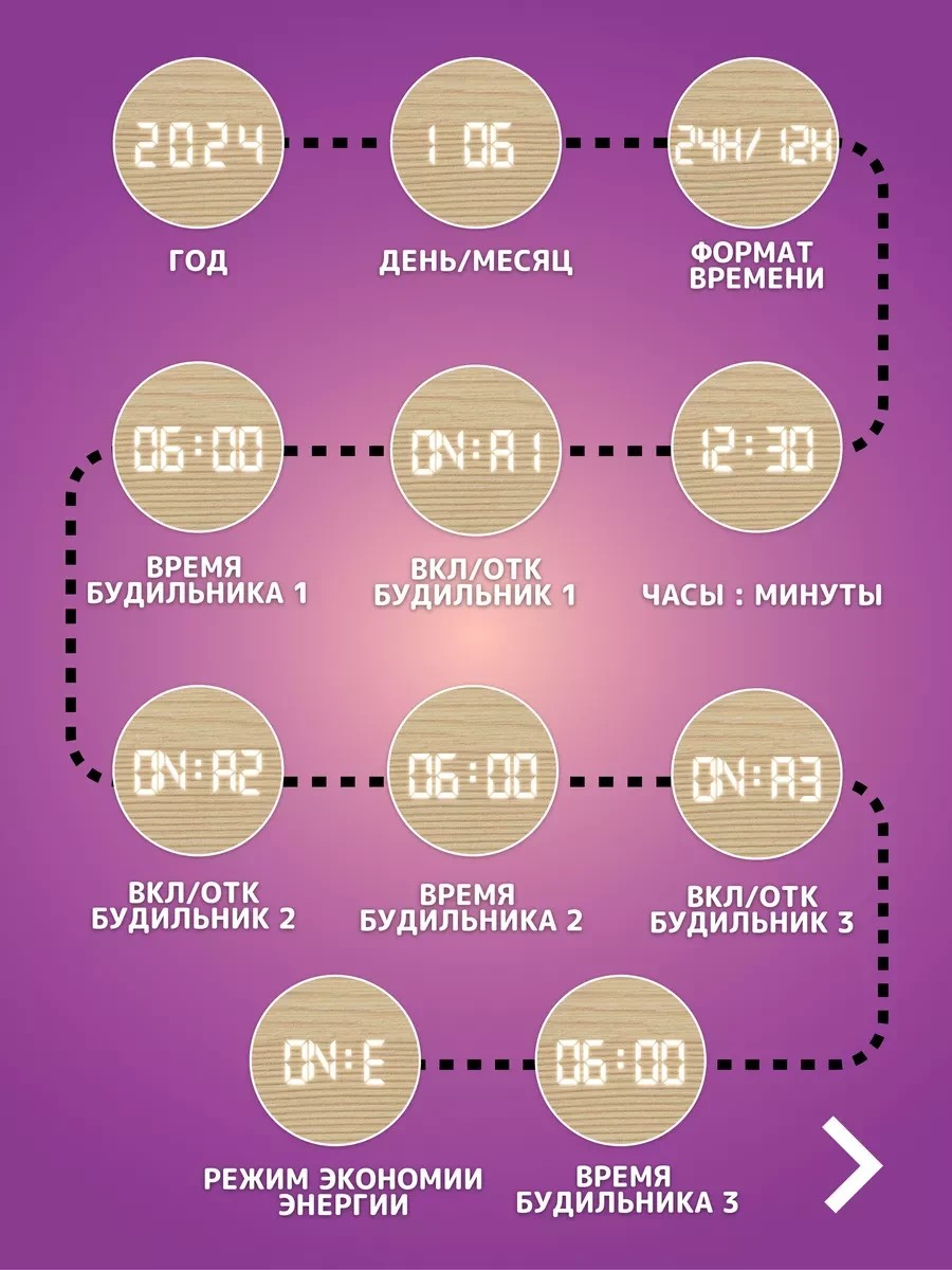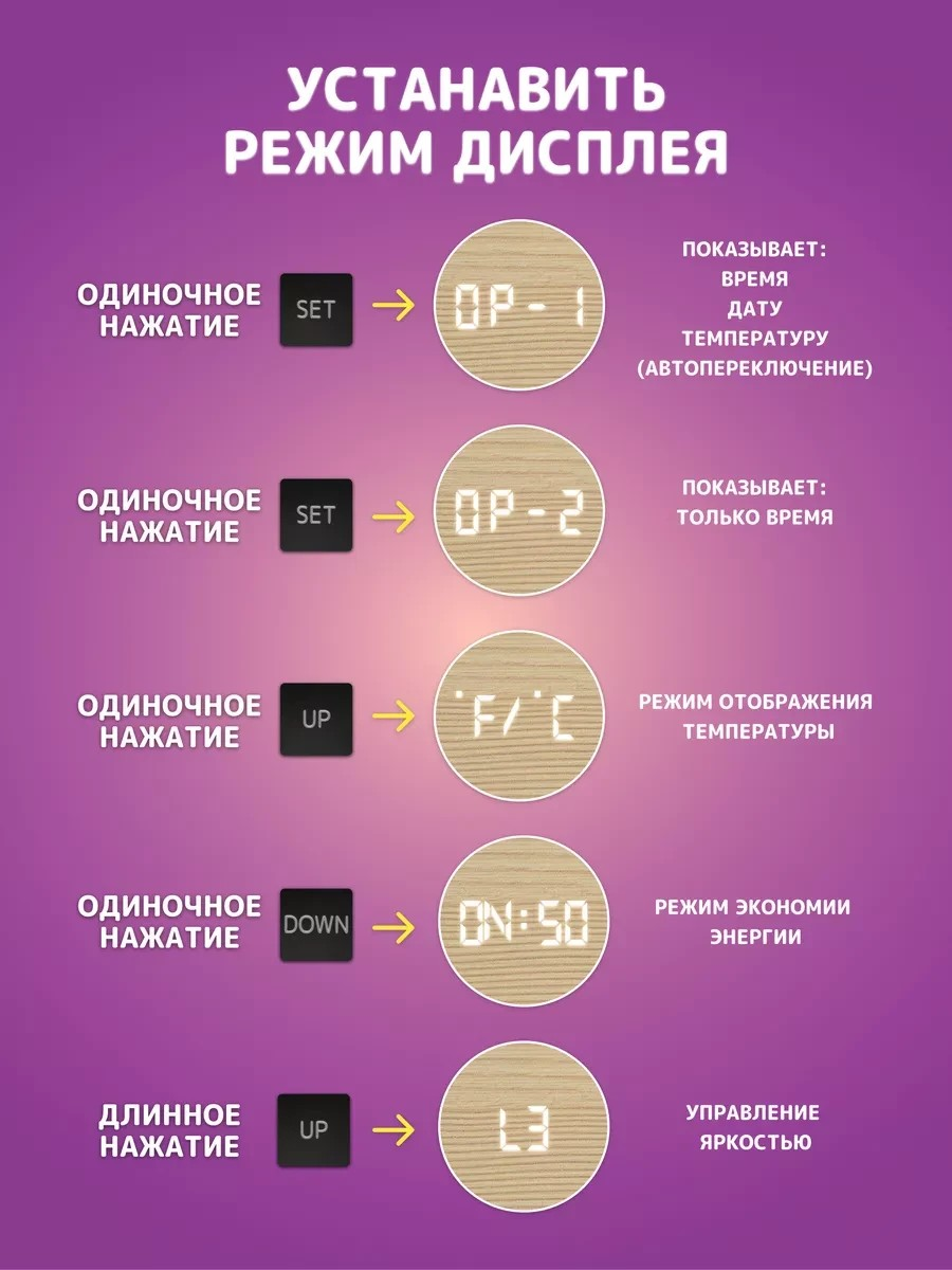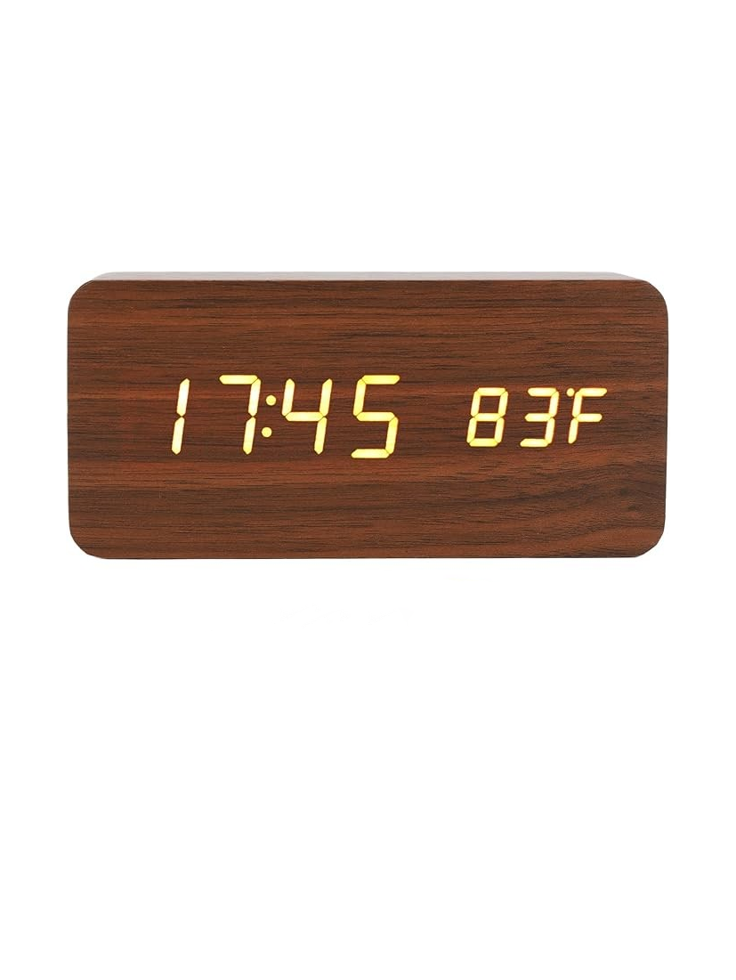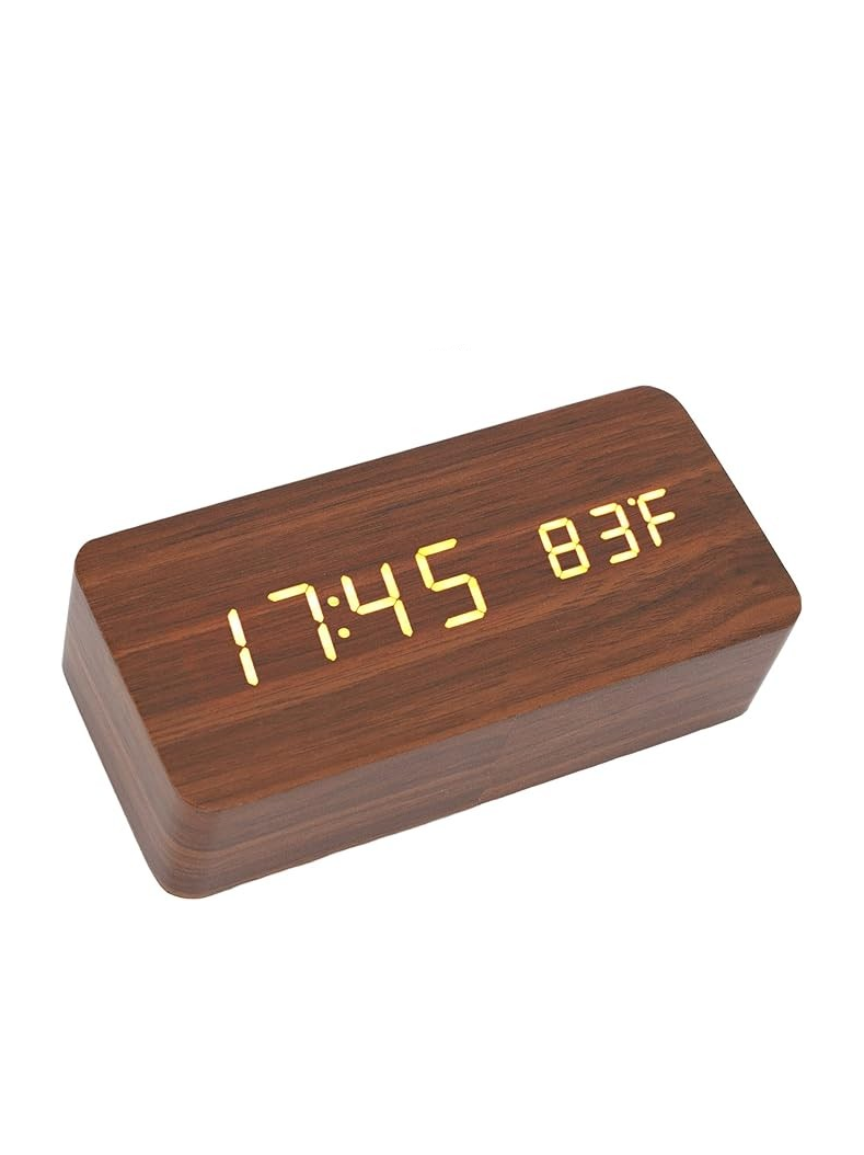 Часы выполнены в виде деревянного бруска (корпус изготовлен из пластика и покрыт пленкой под дерево различных пород). Выглядят очень натурально и могут быть подобранны под любую мебель и обстановку. Экран со светодиодной яркой красивой подсветкой цифр, и отображением времени, даты, температуры. Встроенный будильник на три времени звонка (три звуковых сигнала звучат в течение одной минуты). Понижение яркости на 1/2 c 18:00 до 7:00. Возможность переключения с 12-ти на 24-ти часовой режим. Отображение температуры в градусах Цельсия или Фаренгейта. Питание: USB или ААА батареи (в комплект не входят). Часы не cбрacывaютcя при отключении внешнего питания.