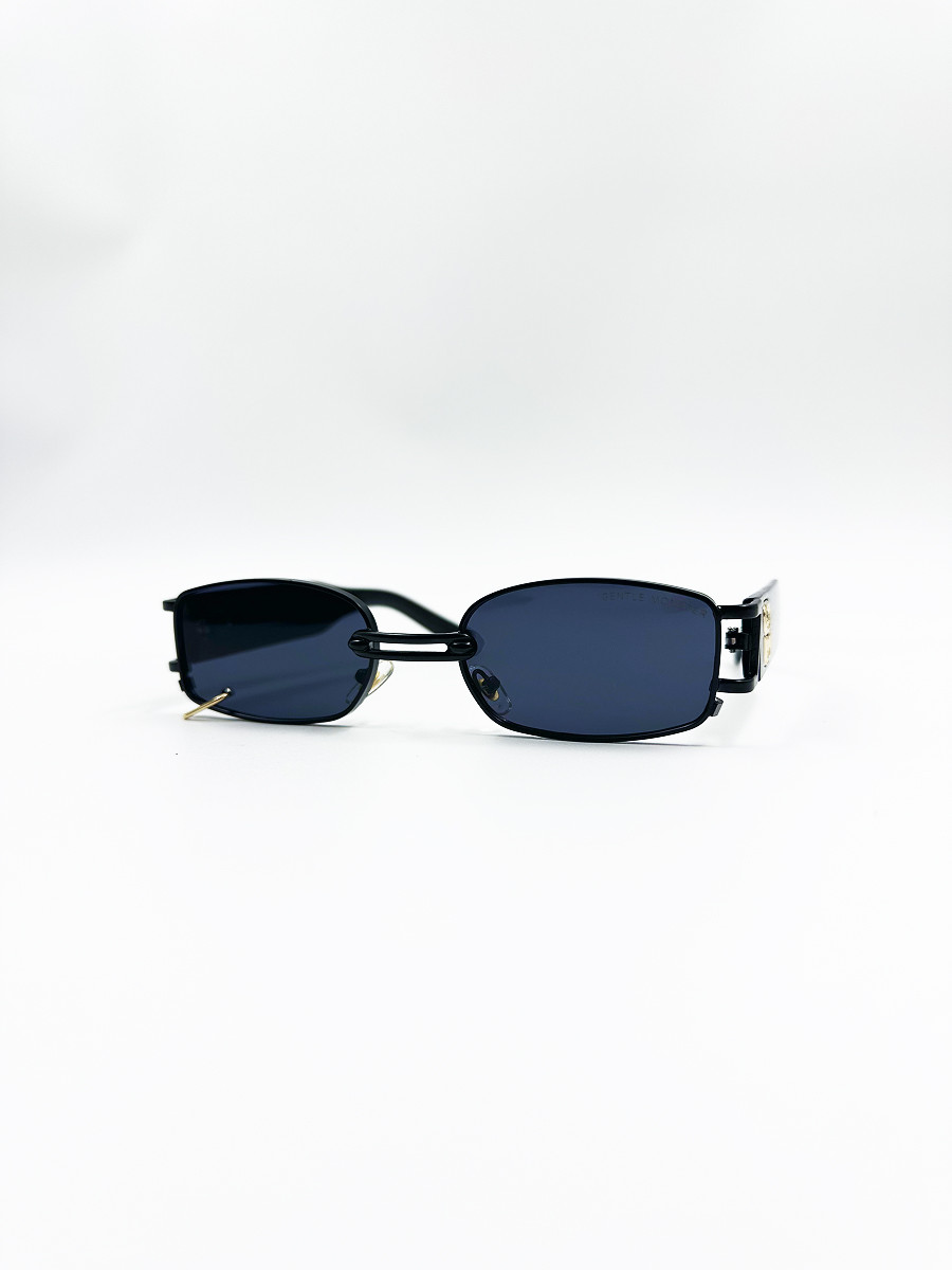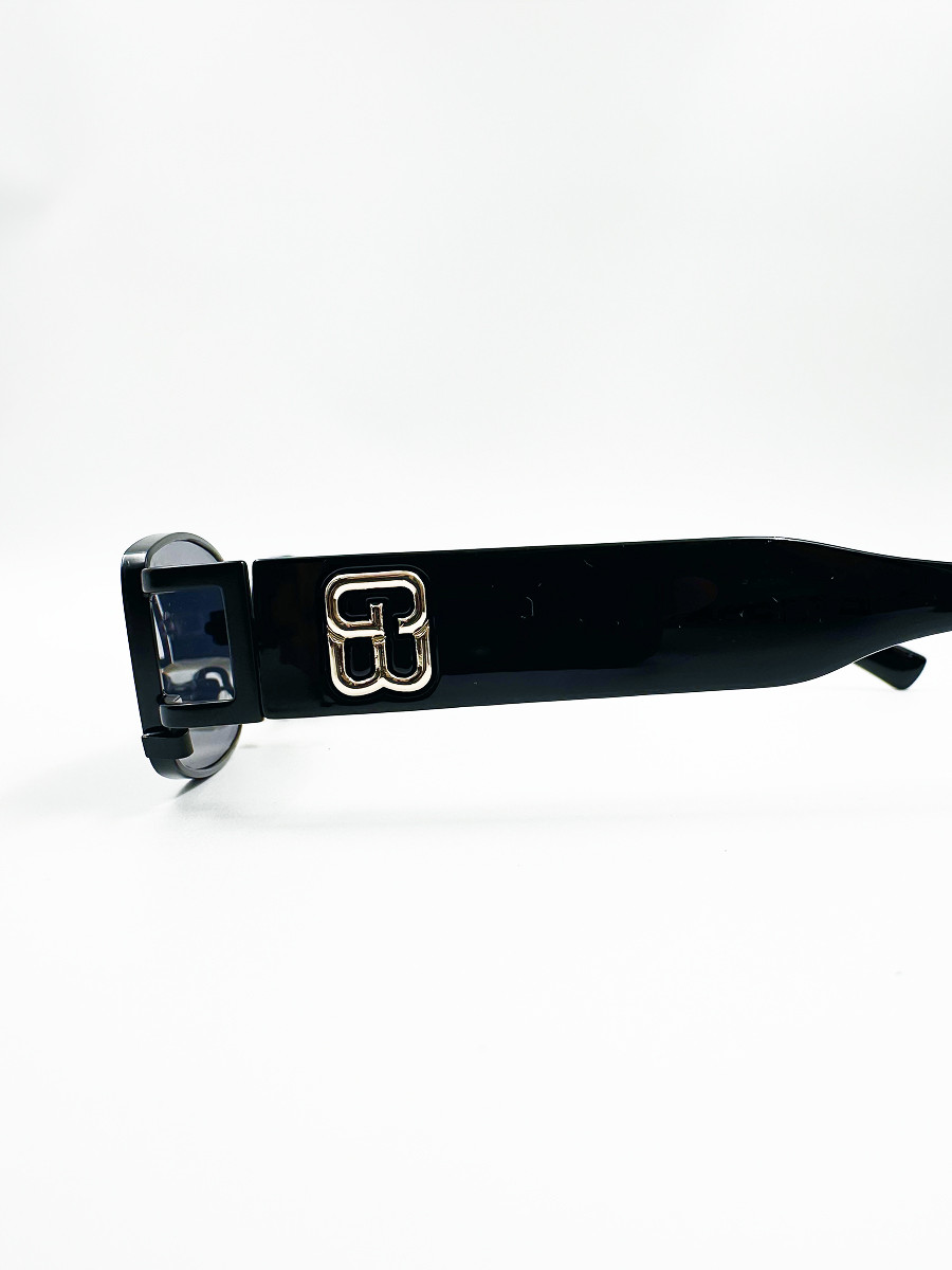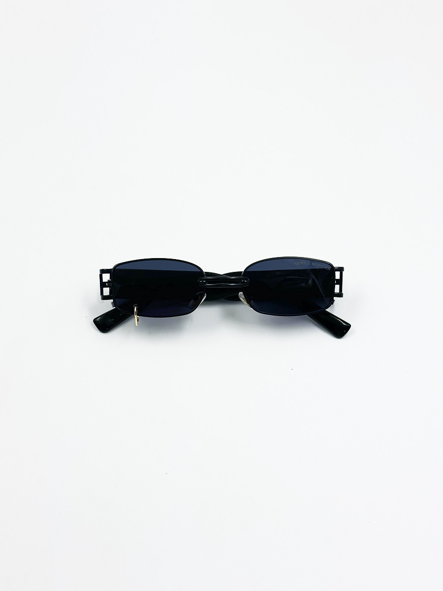 Стильные прямоугольные солнцезащитные очки с черной металлической оправой и темно-синими линзами от бренда Gentle Monster. Имеют минималистичный, но элегантный дизайн с акцентом на массивные заушники, украшенные металлическими деталями. Подходят как для повседневной носки, так и для создания модного образа.
