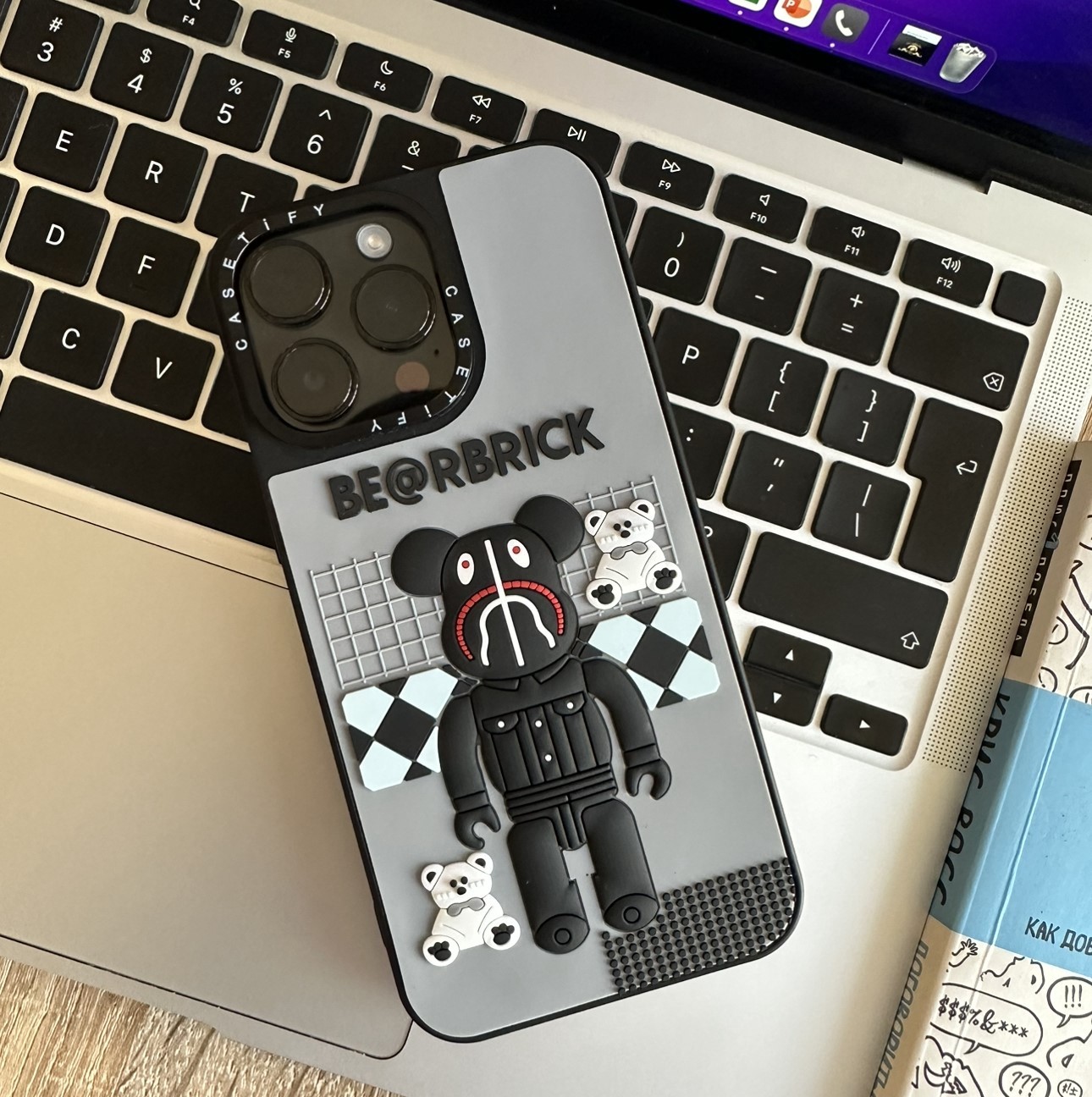 Дизайн чехла выполнен в стиле популярной серии фигурок BEARBRICK, которые известны своим креативным и коллекционным оформлением. Основной акцент сделан на объемном 3D-рисунке медведя BEARBRICK, окруженного повторяющимся узором из крупных букв или тематических элементов. Детализированный рельефный рисунок добавляет чехлу выразительности и тактильного ощущения, делая его не только визуально привлекательным, но и приятным на ощупь.