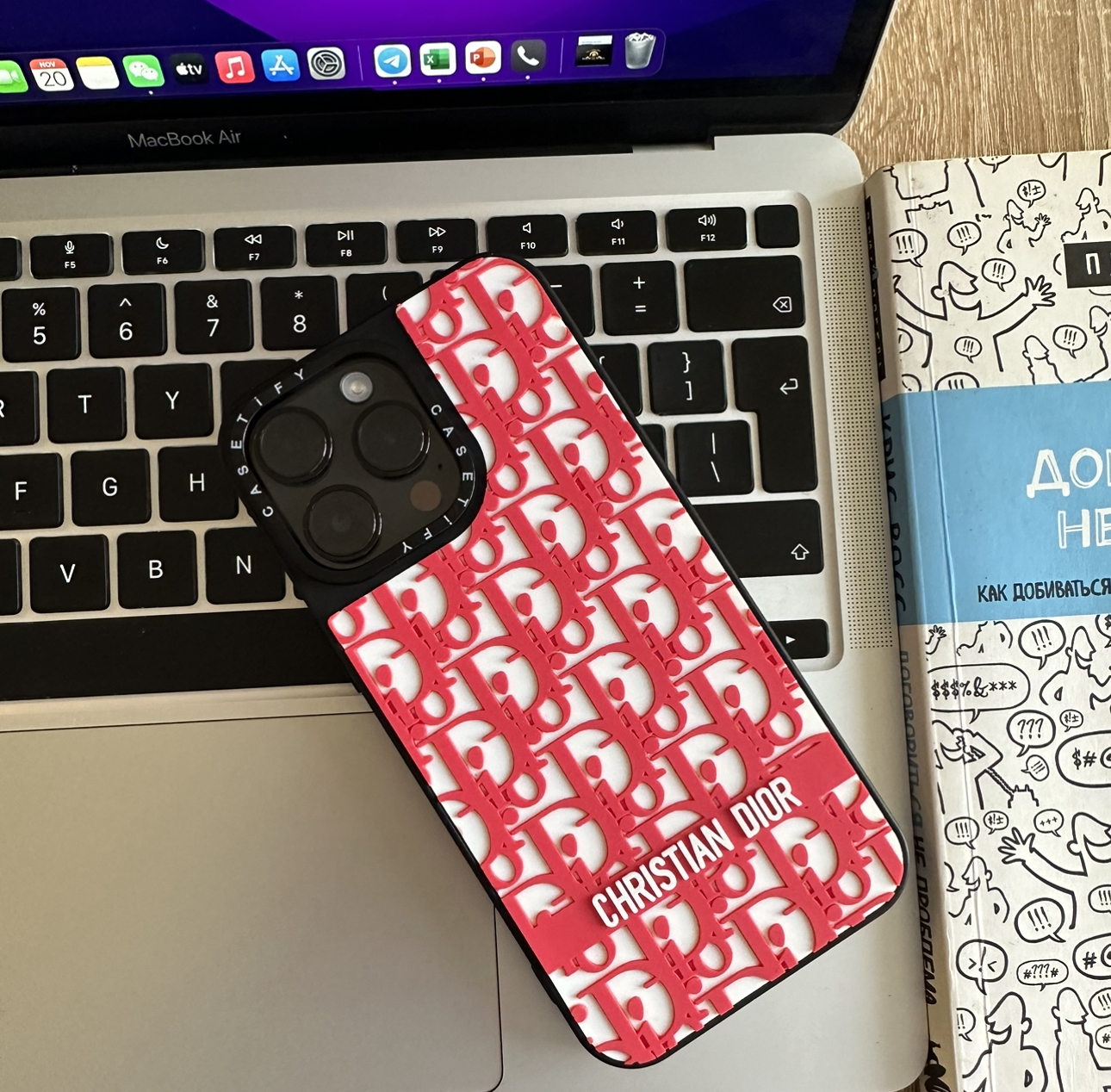 Дизайнерский принт: Чехол украшен узнаваемым логотипом Dior, выполненным в ярком контрастном цвете. Это делает его не только функциональным аксессуаром, но и стильным дополнением к любому образу.