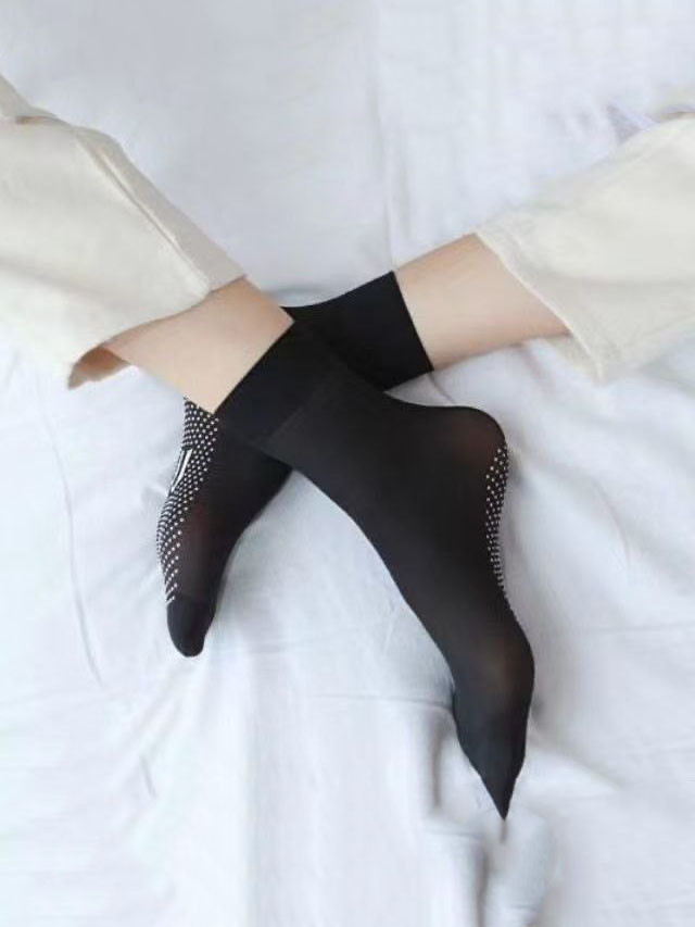 Полупрозрачные капроновые носки с силиконовыми точками на подошве обеспечивают надёжное сцепление с поверхностью и предотвращают скольжение. Идеальны для дома, занятий йогой или повседневной носки. Лёгкий материал приятно облегает ногу и не сковывает движений.
