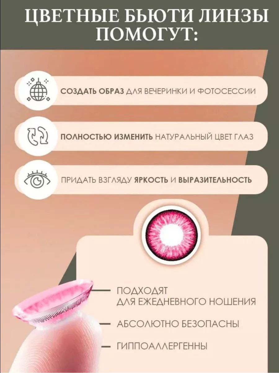 Яркие розовые линзы с эффектом увеличения зрачка идеально подойдут для создания выразительного взгляда, тематических образов, фотосессий и повседневного ношения.