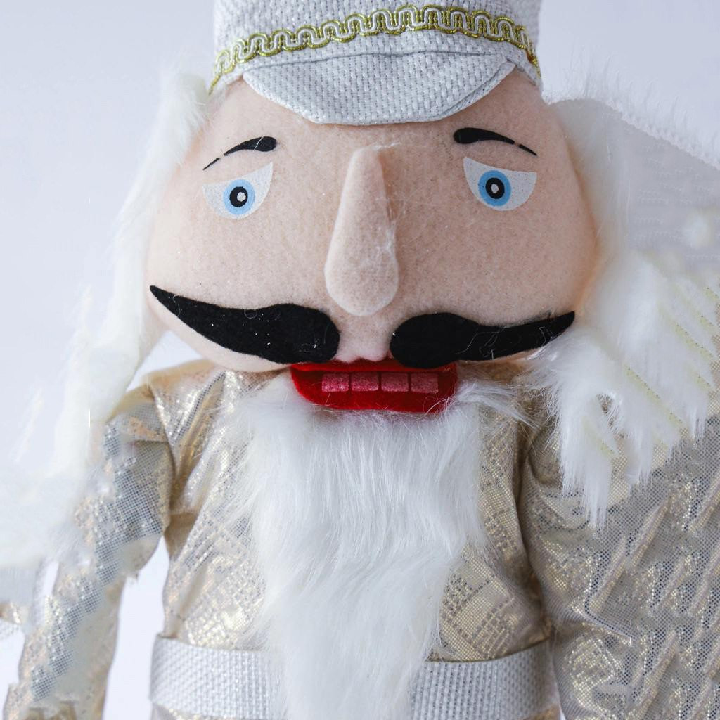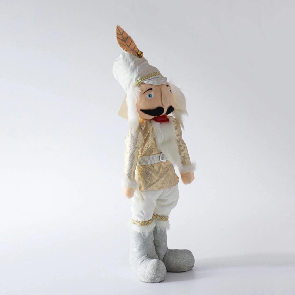Дизайн: Классический Щелкунчик в светлом бело-золотистом наряде. Украшен блестящими деталями и элементами, подчеркивающими праздничное настроение. Шляпа украшена золотой перьевой деталью.