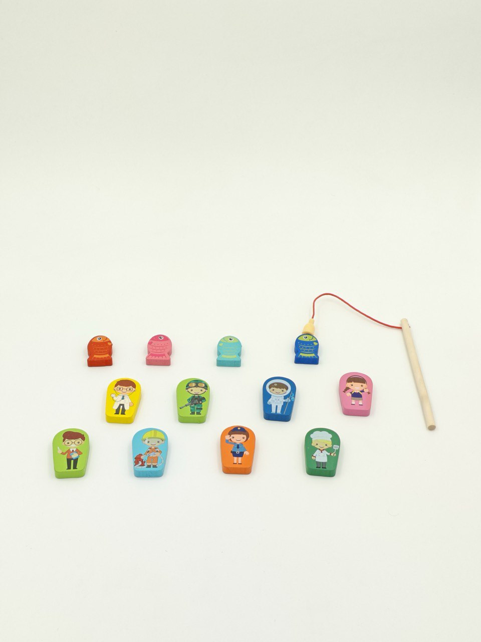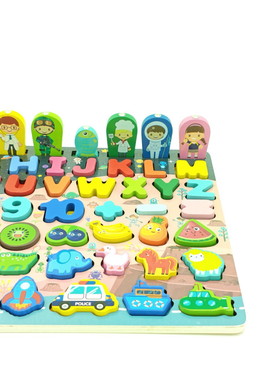 Этот многофункциональный деревянный пазл – отличный способ для ребёнка развивать мелкую моторику, логическое мышление и координацию. В комплект входит набор ярких фигурок фруктов, профессий, букв и животных, а также магнитная удочка для игры в рыбалку. Оборотная сторона пазла оснащена белой доской для рисования с маркером.