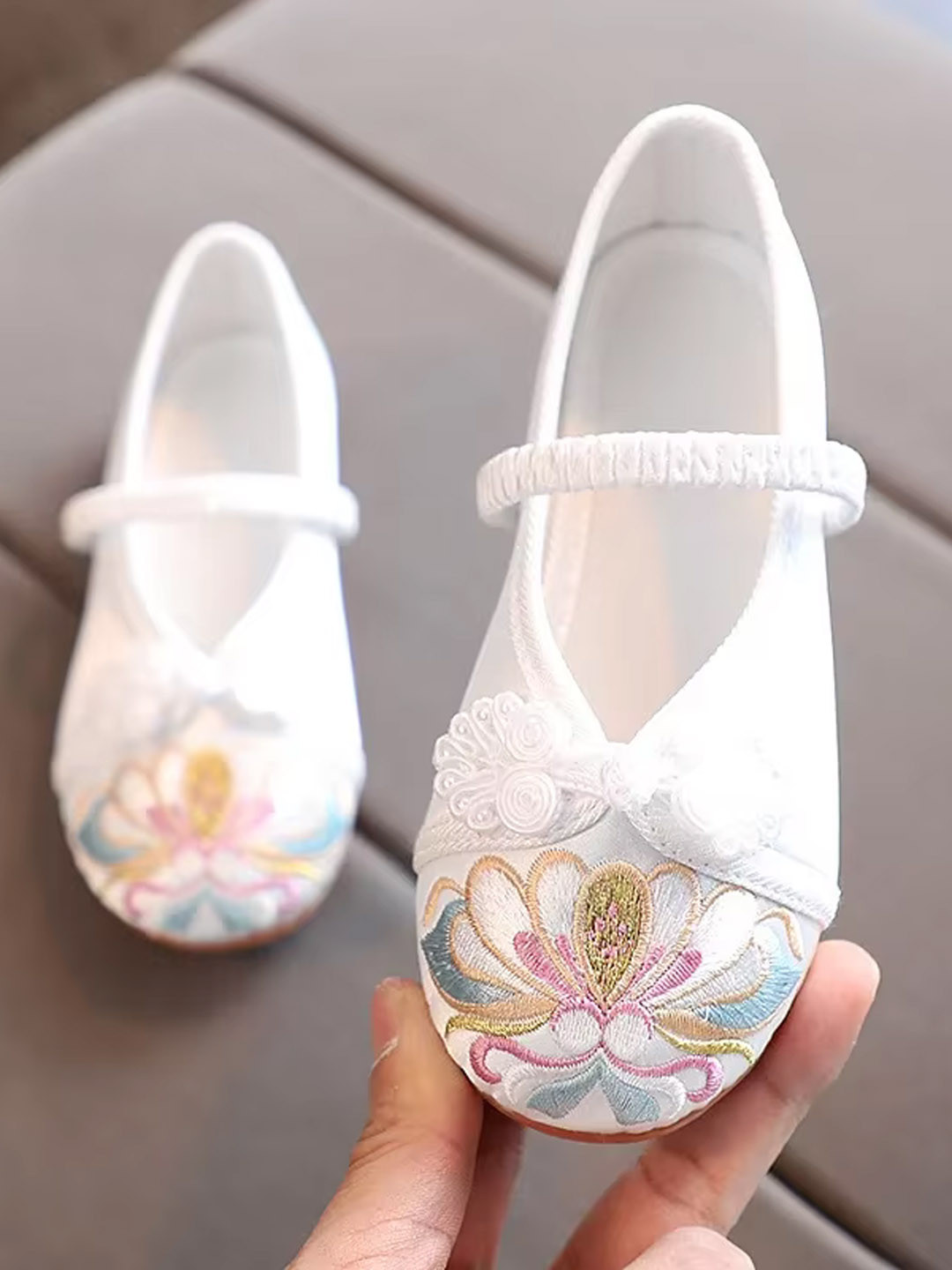 Нарядные детские туфельки с яркой вышивкой в восточном стиле — прекрасный выбор для праздников, выступлений и фотосессий. Белый текстильный верх украшен цветочной вышивкой в пастельных тонах и декоративными элементами на носке. Резинка на подъёме фиксирует обувь и обеспечивает комфортную посадку.