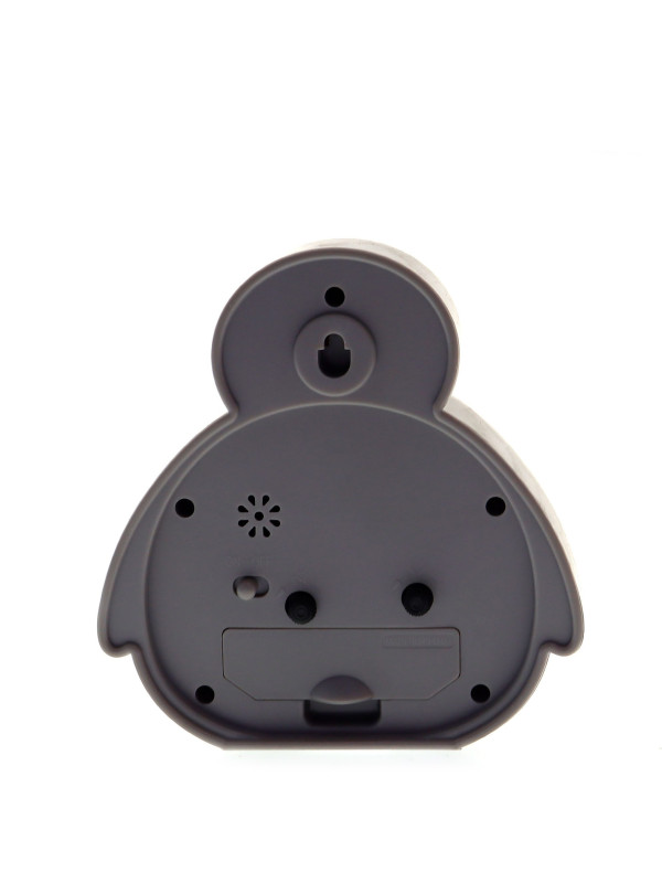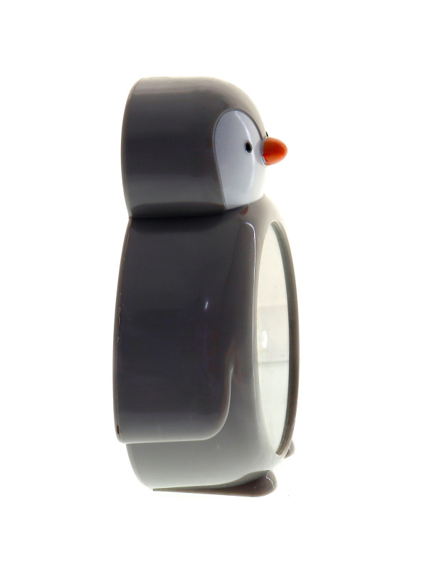 Будильник выполнен в виде милого серого пингвина с оранжевым клювом. Циферблат встроен в его тело, а крупные арабские цифры и контрастные стрелки обеспечивают удобное считывание времени. На задней панели расположены регуляторы для настройки времени и будильника, а также кнопка отключения сигнала.