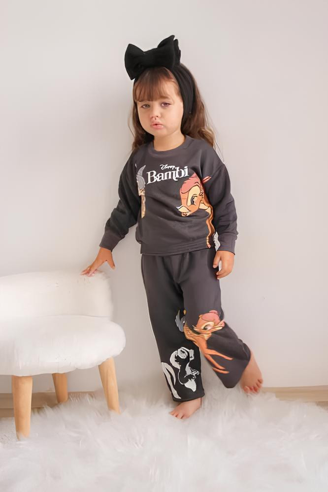 Очаровательный костюм с персонажами Disney — отличный выбор для маленьких модниц. В комплект входят свитшот и свободные брюки с принтом оленёнка Бэмби. Костюм выполнен из мягкого трикотажа, приятен к телу и не сковывает движения. Подходит для прогулок, детского сада и домашнего комфорта.