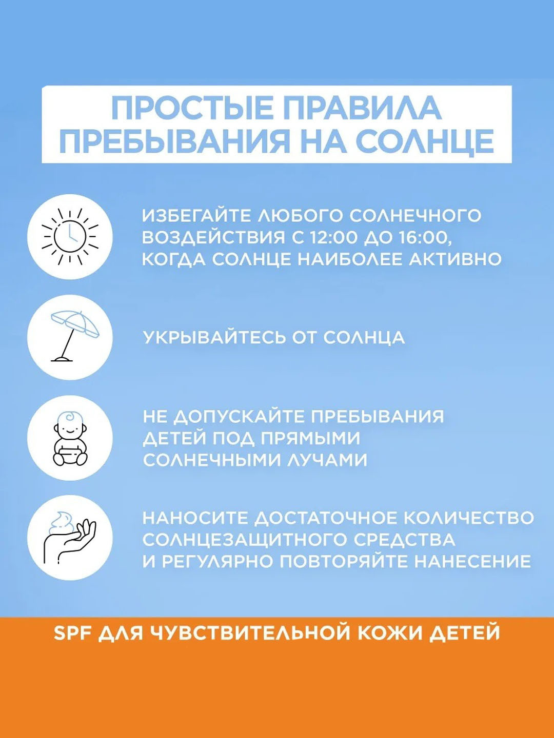 Не допускайте пребывания маленьких детей под прямыми солнечными лучами. Защищайте их при помощи зонта, панамы, очков и футболки. Чрезмерное пребывание на солнце, даже не под прямыми солнечными лучами, опасно. Длительное пребывание на солнце опасно, даже если вы используете солнцезащитное средство, потому что оно не обеспечивает вам 100%-ную защиту. Наносите средство на непокрытые участки кожи вашего ребёнка непосредственно перед выходом. Регулярно возобновляйте нанесение средства для поддержания защиты (особенно после того как ваш ребёнок вспотел). Не рекомендуется пребывание на солнце в часы максимальной солнечной активности. Не наносите на область вокруг глаз. В случае попадания в глаза немедленно обильно промойте водой. Избегайте контакта с одеждой до полного впитывания.