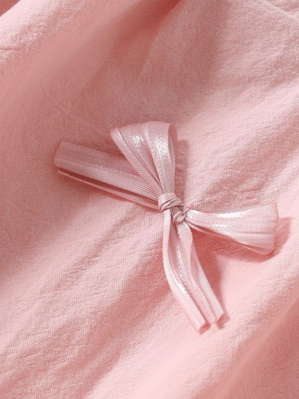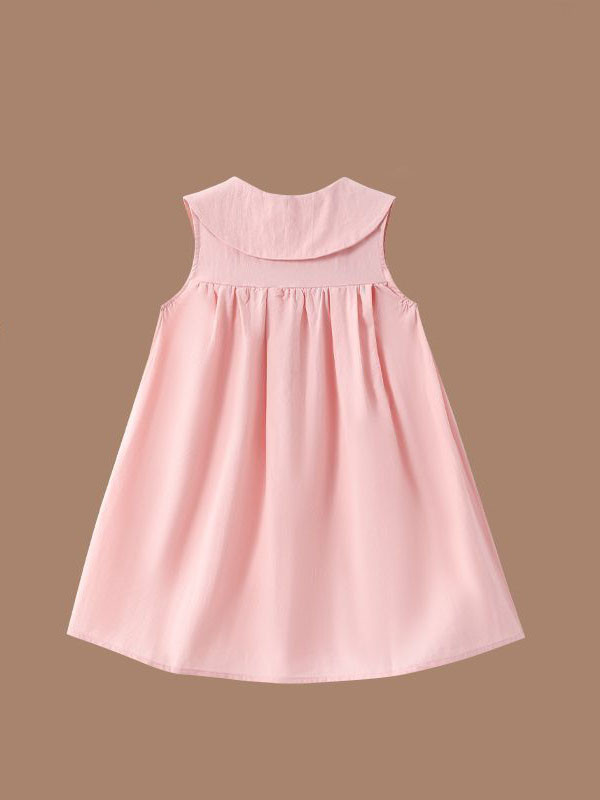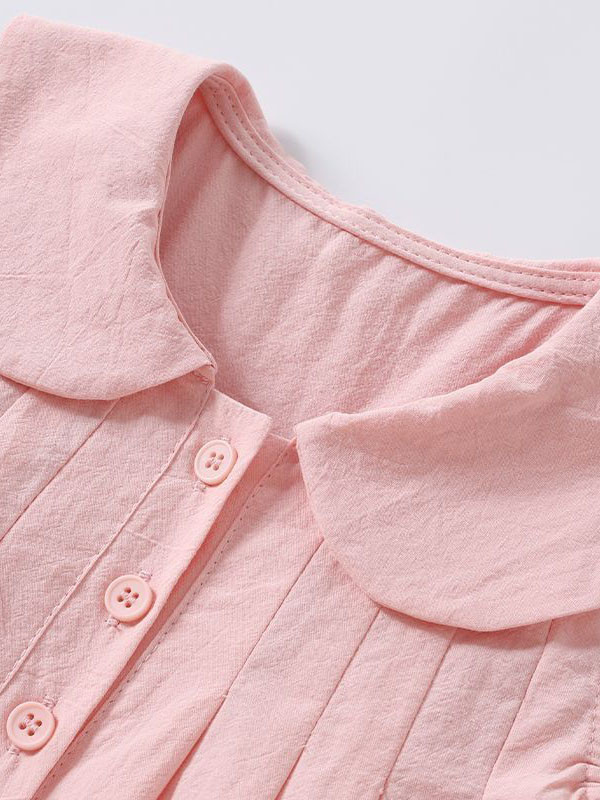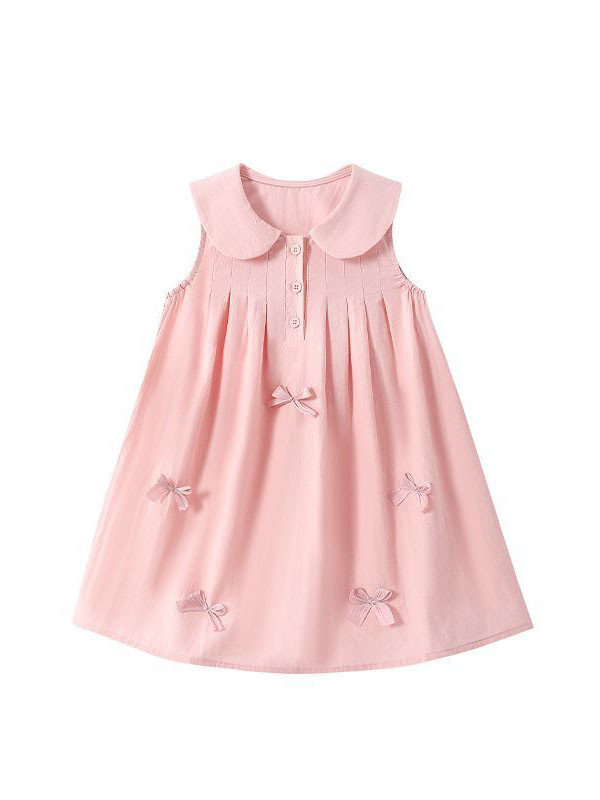 Очаровательное летнее платье для девочек выполнено в мягком розовом оттенке. Декорировано милыми бантиками и имеет аккуратный воротник "Питер Пэн". Идеально подходит для тёплой погоды и особых случаев.