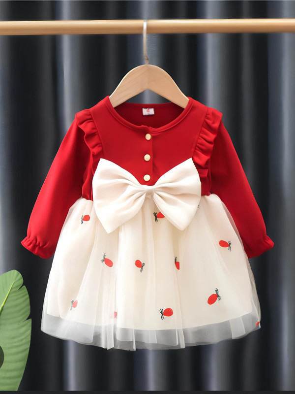 Очаровательное платье для девочки в нежном сочетании красного верха и кремовой юбки с вишневым принтом. Идеальный выбор для праздников, фотосессий и торжественных мероприятий.