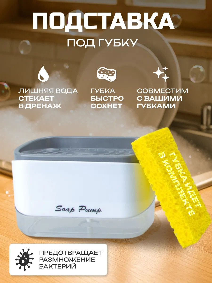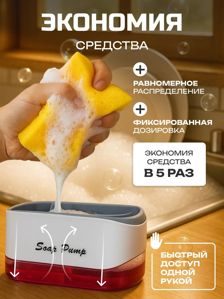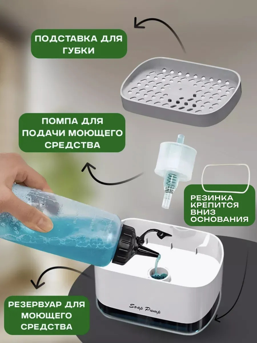 Кухонный диспансер -это умный дозатор для моющего средства с губкой в подарок. Диспенсер для моющего средства — идеальное решение для поддержания чистоты и порядка на кухне. Этот удобный диспенсер для мыла оснащен встроенным держателем для губки, что позволяет хранить губку и моющее средство в одном удобном месте. Сам держатель для губки изготовлен из прочных, высококачественных материалов, рассчитанных на то, чтобы выдерживать суровые условия ежедневного использования, поэтому вы можете быть уверены, что он прослужит долгие годы. Дозатор на кухню имеет простую и удобную конструкцию, что делает его идеальным для использования на любой кухне. Дозатор для моющего средства на кухню поможет вам избавиться от мыльных и водяных разводов раковины, сэкономить ваше средство для мытья посуды, сэкономить ваше время на мытье посуды, а так же поддерживать чистоту и красоту на вашей кухне! Очень удобная и нужная кухонная принадлежность, от которой вы будете довольны! Диспенсер для моющего средства на кухню — идеальное решение для тех, кто хочет содержать свою кухню в чистоте и порядке. Благодаря встроенному держателю для губок, удобному дизайну и стильному внешнему виду этот диспенсер станет незаменимым помощником на любой кухне. Дозатор для посуды поможет сэкономить время и усилия, сохраняя при этом чистоту на кухне. Автоматический для губки на кухню изготавливается из качественного пищевого пластика. Вся ваша кухонная утварь , очень нужная на кухне и каждой хозяйке для губок на раковину