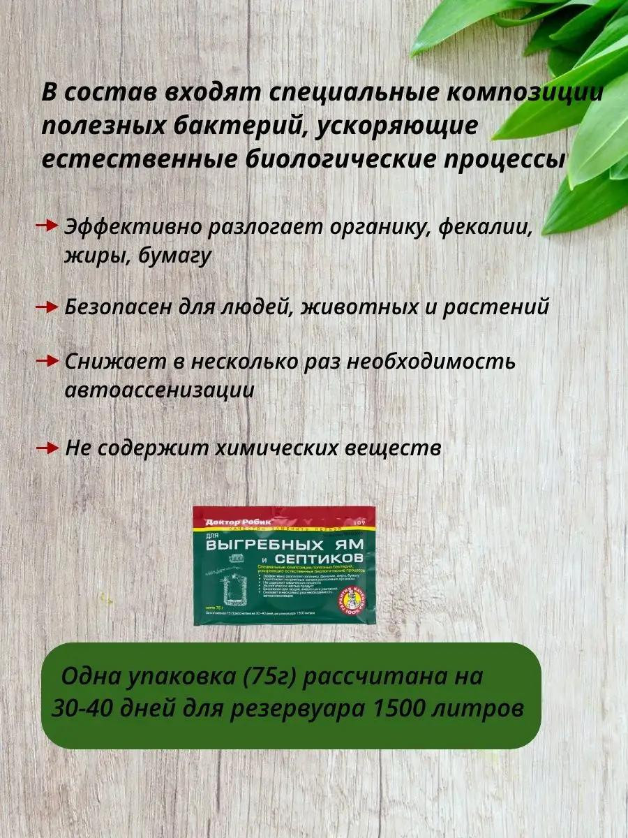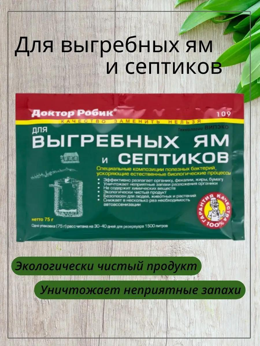 Доктор Робик для выгребных ям и септиков способнен в течение короткого времени утилизировать бумагу, фекалии, жиры, белки, целлюлозу, мочевину, крахмал. Препарат Др. Робик на биологической основе, предназначенный для очищения дачного туалета, выгребной ямы и септиков от нечистот и отходов жизнедеятельности человека.