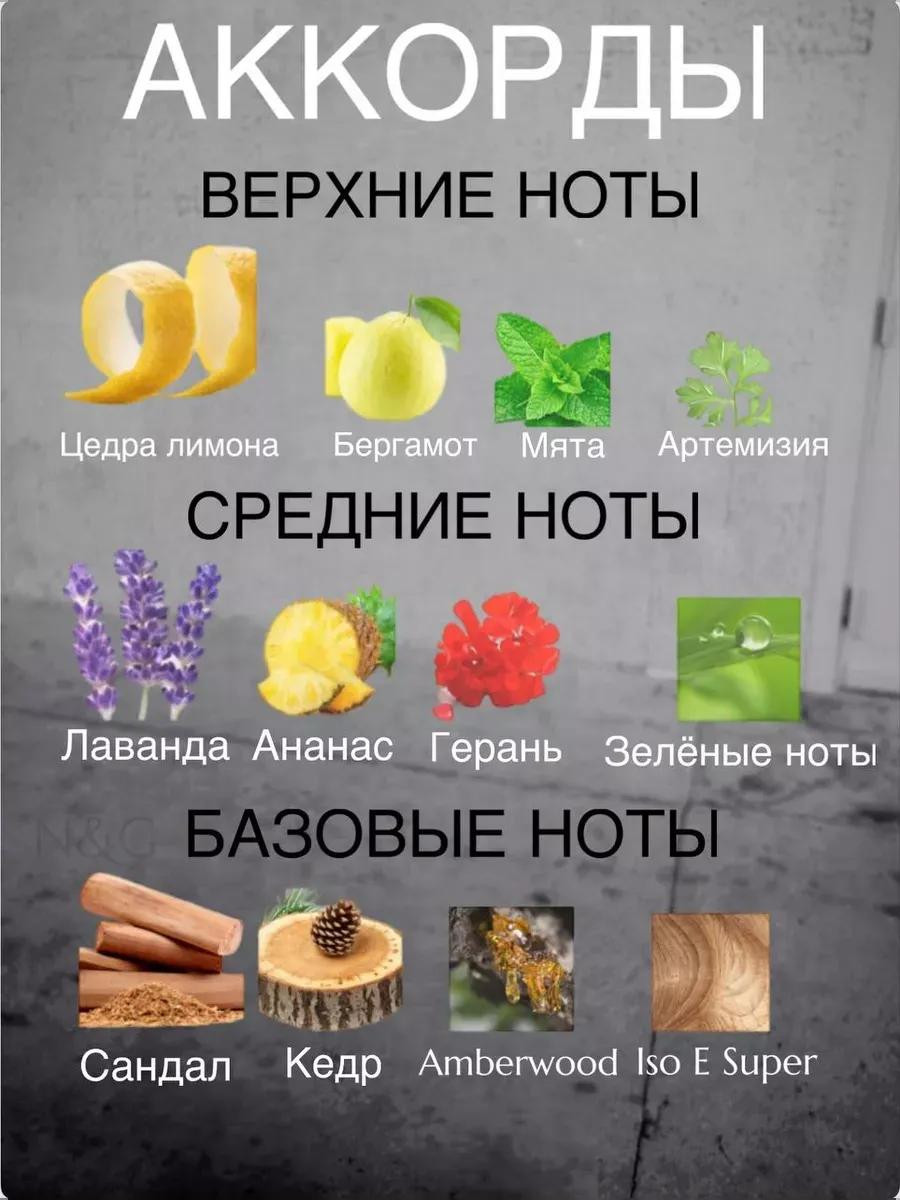 строгий и элегантный аромат, в котором нет ничего лишнего. Верхние ноты — свежий цитрусовый аромат, дополненный нотками ветивера и розового перца. Сердце аромата играет яркими оттенками кедра и грейпфрута. Базовые ноты звучат смесью сандала и имбиря, а аромат ладана дополняет композицию, делая её ещё более загадочной и манящей.
