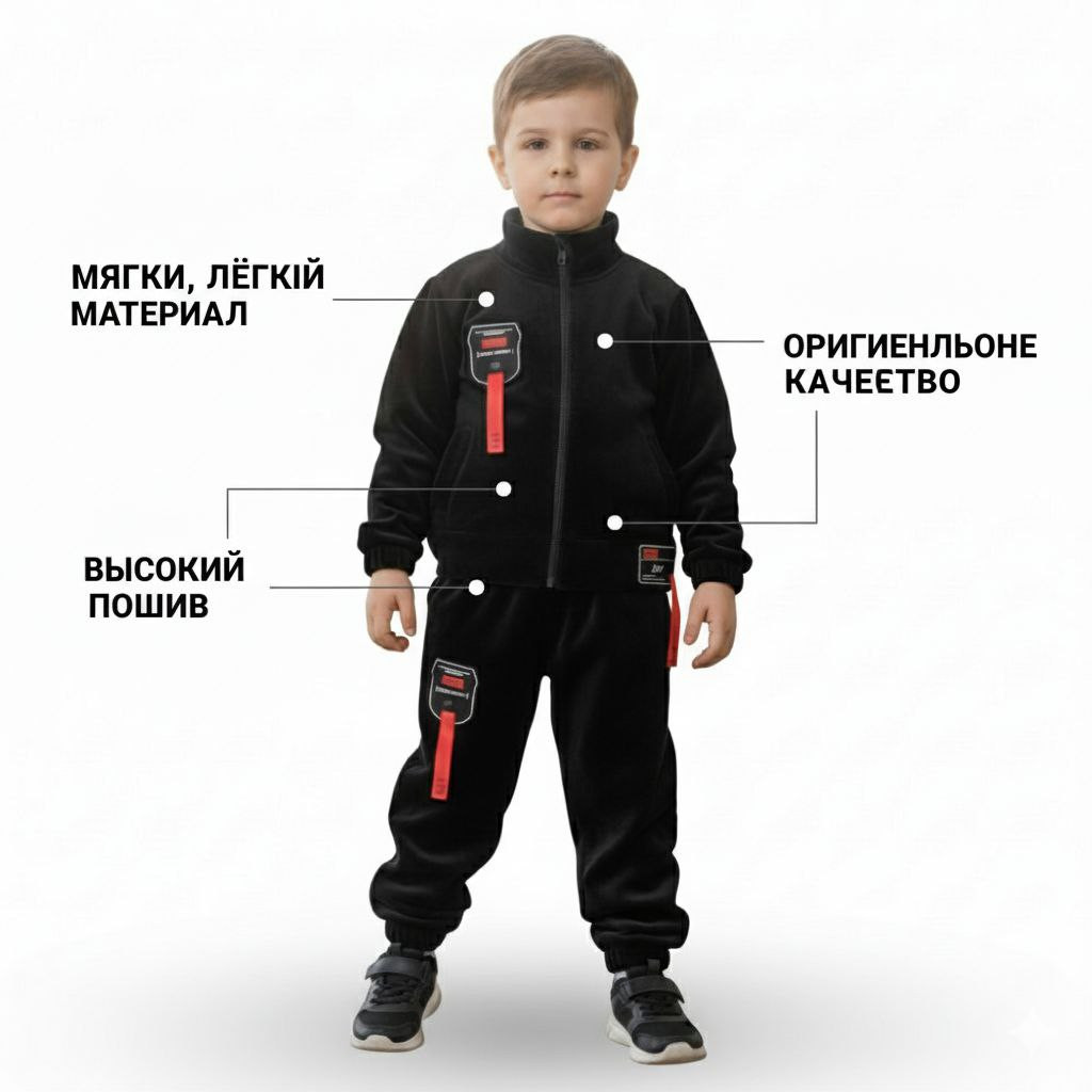 Двойка для мальчика.В комплекте идут штаны и костюм.Ткань очень мягкая комфортная, высокая качество пошив, бархатистая, плотная ткань, манжеты на рукавах и брюках. Идут в прохладные дни .
