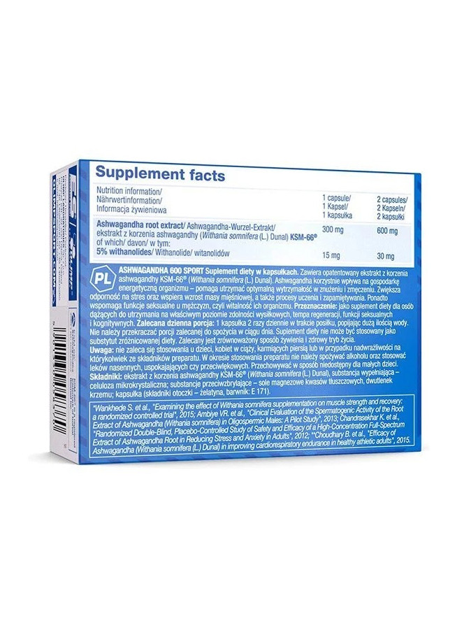 Olimp Ashwagandha 600 Sport — это высококачественная добавка с экстрактом корня ашваганды, которая поддерживает физическую выносливость и способствует улучшению кардиореспираторной выносливости. Этот продукт особенно полезен для спортсменов и людей, занимающихся интенсивными тренировками, так как помогает увеличить физическую активность и улучшить восстановление после нагрузок. Ashwagandha поддерживает гормональный баланс, улучшает выносливость и помогает справляться с физическим и умственным стрессом.