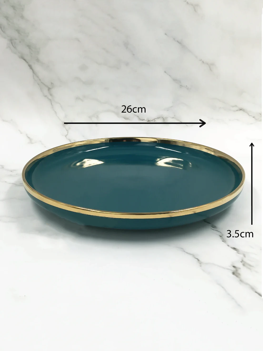 Элегантная тарелка глубокого изумрудного цвета с изысканной золотой окантовкой – воплощение утончённого стиля и роскоши. Её гладкая глянцевая поверхность отражает свет, создавая впечатление глубины и благородства. Диаметр 26 см и высота 3,5 см делают её идеальной для подачи как основных блюд, так и изысканных закусок. Эта тарелка станет не только функциональной частью сервировки, но и изысканным акцентом на вашем столе, подчёркивая ваш безупречный вкус.