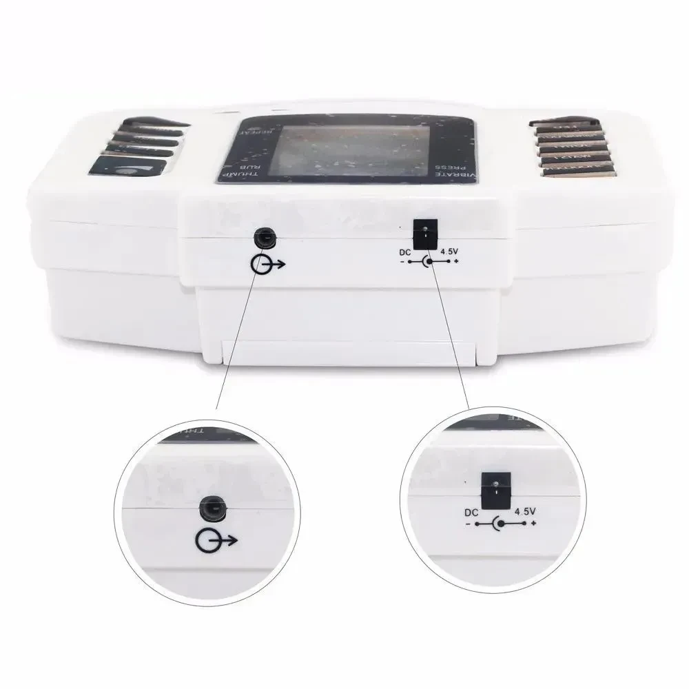 При включении прибора стартует таймер. Сеанс рассчитан на 15 минут, после чего прибор отключится. Во время сеанса Вы можете выбирать 4 режима воздействия: 1) Поглаживание (кнопка ПОГЛ) - высокочастотное несильное воздействие, от слабого к более сильному, потом сброс и снова от слабого к сильному и т.д.; 2) Растирание (кнопка РАСТ) - импульсы реже, но сильнее, характер изменения сигналов как при поглаживании; 3) Вибрация (кнопка ВИБР) - импульсы ещереже и еще сильнее, все время одной интенсивности; 4) Постукивание (кнопка ПОСТ) - импульсы еще реже, но самые сильные, по очереди ощущается импульс то на одном, то на другом электроде. Расположены кнопки в логической последовательности и на протяжении сеанса можно постепенно переключаться от 1 до 4 режима. Если есть необходимость, можно регулировать силу и скорость (кнопки "-" и "+" внизу) импульсов. 6 зон массажа,4 режима массажа, 8 уровней мощности массажа, 9 скоростей интенсивности. Способ применения: сначала подключите прилагаемые в комплекте электроды с подушечками в соответствующий разъем на корпусе прибора и приложите на тело в нужном месте. Затем включите прибор и с помощью кнопок, расположенных с левой стороны от дисплея, выберите обрабатываемую зону тела (ноги, талия, руки, грудь, плечи и т.д.) и нужный режим работы (кнопки справа от дисплея). Ваш выбор будет сопровождаться соответствующими визуальными подсказками, отображаемыми на электронном дисплее. После 15 мин работы прибор автоматически отключается. Если вам недостаточно этого времени, то просто нажмите кнопку «Repeat», чтобы повторить процедуру или задайте новые настройки.