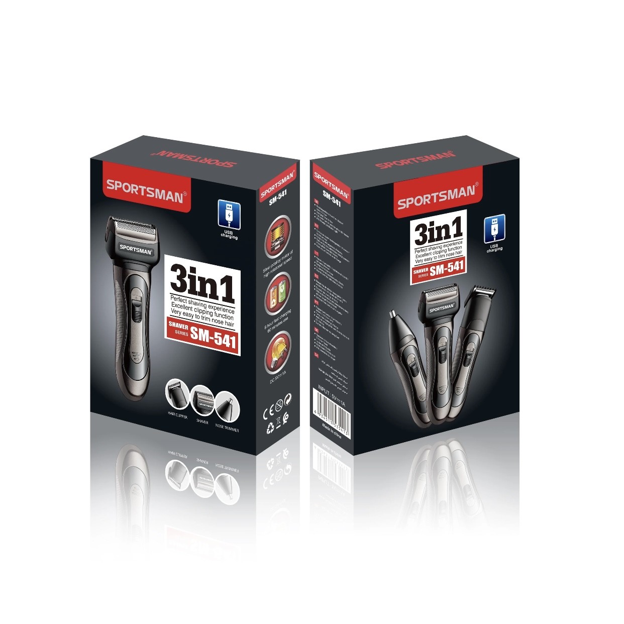 Спортсмен SM-541 трансграничный Лидер продаж мужская перезаряжаемая бритва. универсальный прибор серии 3 в 1. Его можно использовать как машинку для стрижки, как триммер для состригания нежелательных волос в носу или ушах, а также использовать как самую обычную электробритву. Богатый комплект легко и быстросменных насадок позволяет все это осуществить с машинкой Спортсмен SM-541. Для смены насадки достаточно повернуть круговым движением, на 90 градусов, ту насадку, которую хотите снять, а потом в обратном порядке установить новую.** Технические характеристики:**-