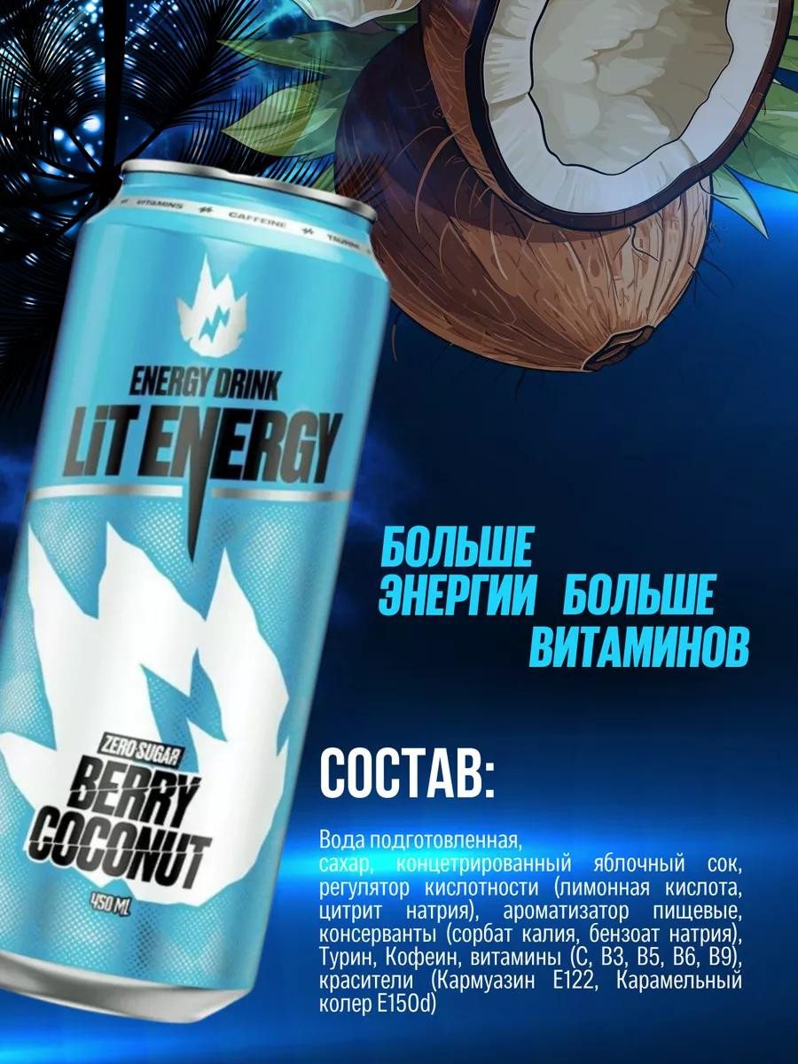 Новый долгожданный вкус из линейки энергетических напитков от Михаила Литвина LIT ENERGY BERRY COCONUT ZERO SUGAR. Яркий оригинальный вкус, которого еще не было в мире энергетических напитков. Этот безалкогольный летний тонизирующий энергетик содержит ударную дозу кофеина и таурина, а также натуральные растительные ингредиенты и витамины. Litenergy создан специально для активных людей, чтобы поддерживать их уровень энергии и помогать справляться с летней жарой. Продолжение энергетических напитков без сахара снова порадует любителей получить заряд энергии, бодрости и витаминов. Спортивный энергетик имеет приятный вкус кокоса в сочетании с ягодной кислинкой, которые дарят незабываемое послевкусие и желание покорять новые вершины. Наслаждайтесь активным летом с дополнительной энергией и бодростью от Литэнерджи!