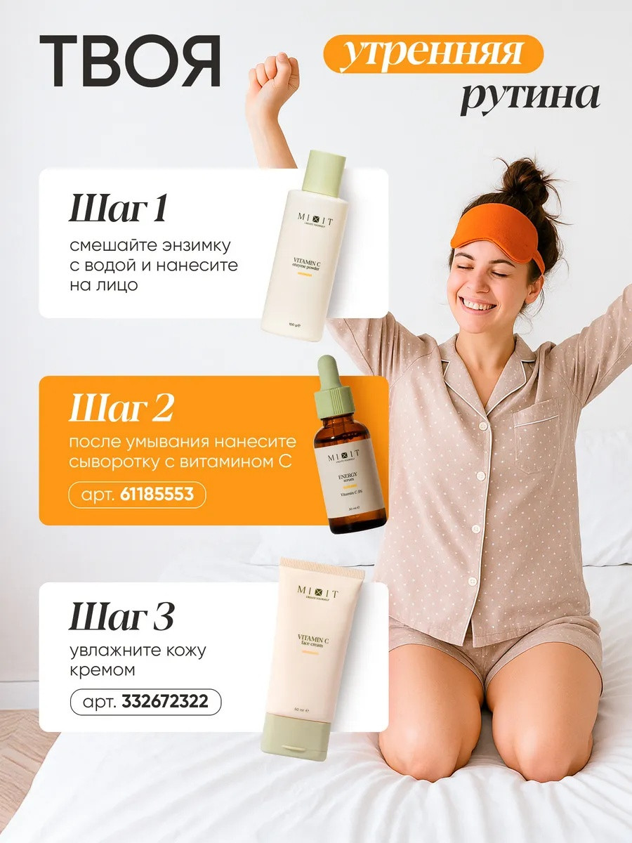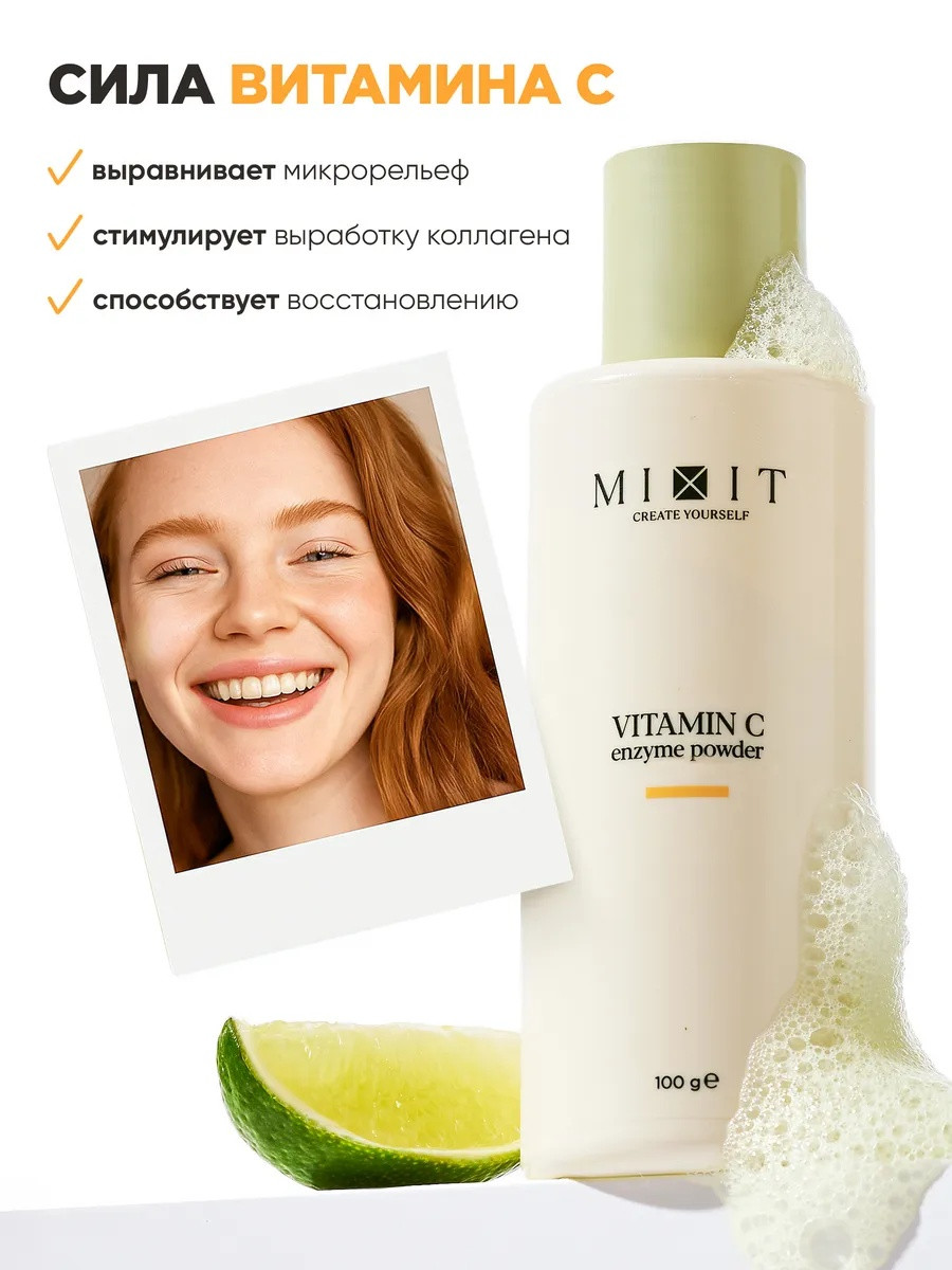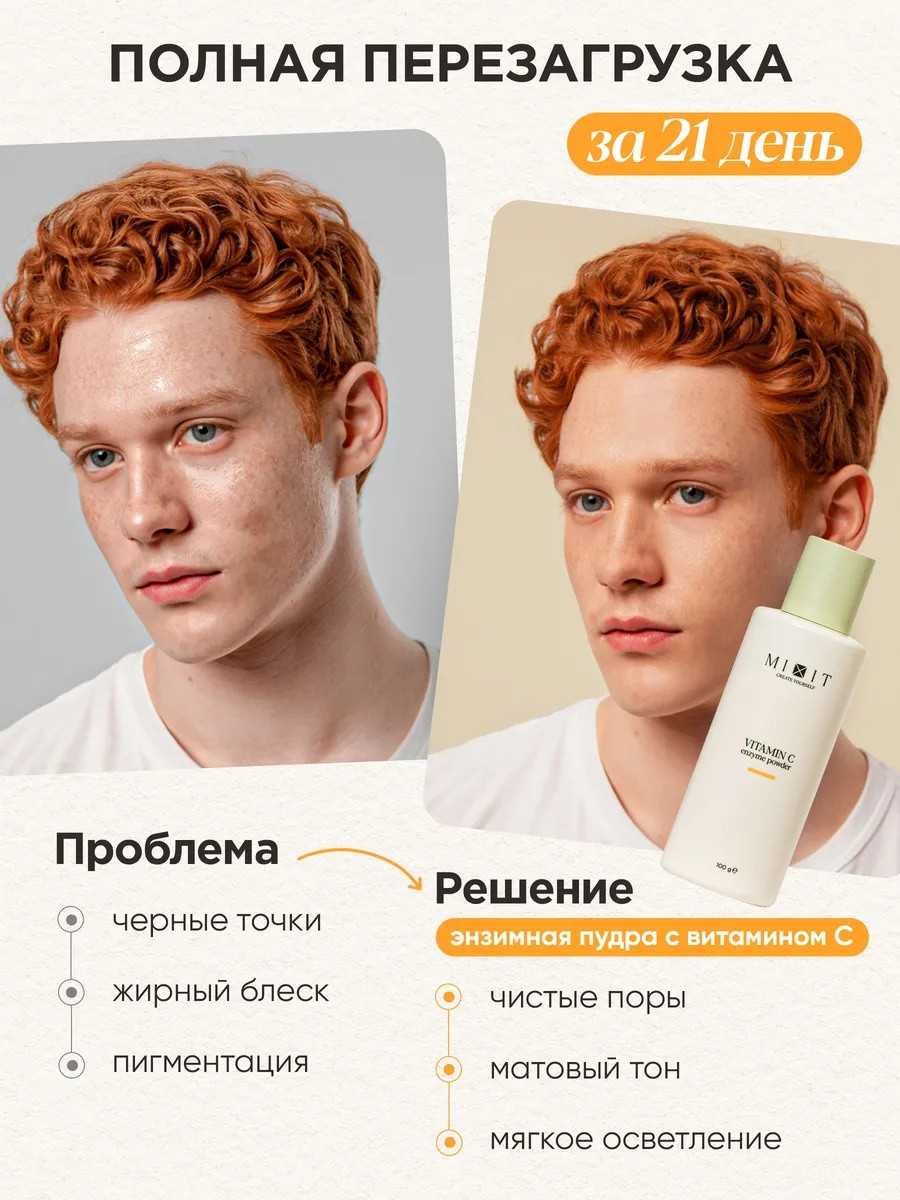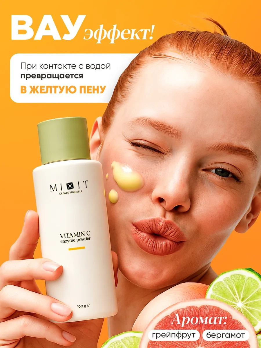 Энзимная пудра-пилинг- пенка для лица с витамином С — это идеальное решение для ухода за проблемной кожей, сухой и особенно для подростков и взрослых, страдающих от акне, прыщей, высыпаний, выравнивания тона кожи и также отбеливания, и круто работает для сужения пор! Очищающая мягкая энзимная пудра от прыщей и черных точек для умывания mixit для лица, как комплексный уход, выполняет функцию мягкого эксфолианта, помогает эффективно удалить черные точки и комедоны, а также способствует сужению пор, и также подходит от вросших волос. Использование энзимной пудры против от расширенных пор повышает увлажнённость и упругость кожи, осветляет пигментные пятна, выравнивает тон и защищает от тусклости, возвращая здоровый цвет и сияние. Пудра-маска или маска пудра рассыпчатая подходит как для женщин, так и для мужчин, включая подростков, и может использоваться как умывалка для лица или как маска-пилинг, с отбеливание лица! Умывашка для лица эффективно справляется с жирностью кожи, снимает воспаления и предотвращает появление новых высыпаний, что особенно важно для жирной и комбинированной кожи. Благодаря витамину С и папаину умывалка от черных точек работает не только как средство от прыщей и акне или для удаления черных точек, но и как уход с антиоксидантным действием, который замедляет появление морщин и способствует регенерации, а также, против жирного блеска, против камедонов! энзимная пудра для умывания с витамином с - это профессиональная косметика для красоты, которая может применяться и для тела — энзимная маска пилинг помогает бороться с вросшими волосами после депиляции, предотвращает раздражения и делает кожу гладкой. Это делает продукт универсальным: он совмещает уходовую косметику для лица и тела, а также подходит для тех, кто выбирает косметику для очищения кожи, маска из энзимной пудры дает осветление кожи и также этот продукт подходит для мужского ухода! Энзимка — ваш надёжный помощник в ежедневном уходе: для жирной, комбинированной и чувствительной кожи, при проблемах с угрями, постакне и жирным блеском. Независимо от сезона косметика женская для макияжа обеспечивает деликатное и глубокое очищение, устраняет шелушения и возвращает ощущение чистоты и комфорта. Подарите энзимную увлажняющую пудру порошок себе или близким: это универсальное средство для осветления кожи лица, от расширенных пор - станет отличным презентом на день рождения, ведь чистая и сияющая кожа и пудра для умывания лица — лучший подарок для любой женщины, или подростка! умывалка для лица от черных точек – энзимка отбеливающая также имеет большой объем пудры, который хватит вам надолго!