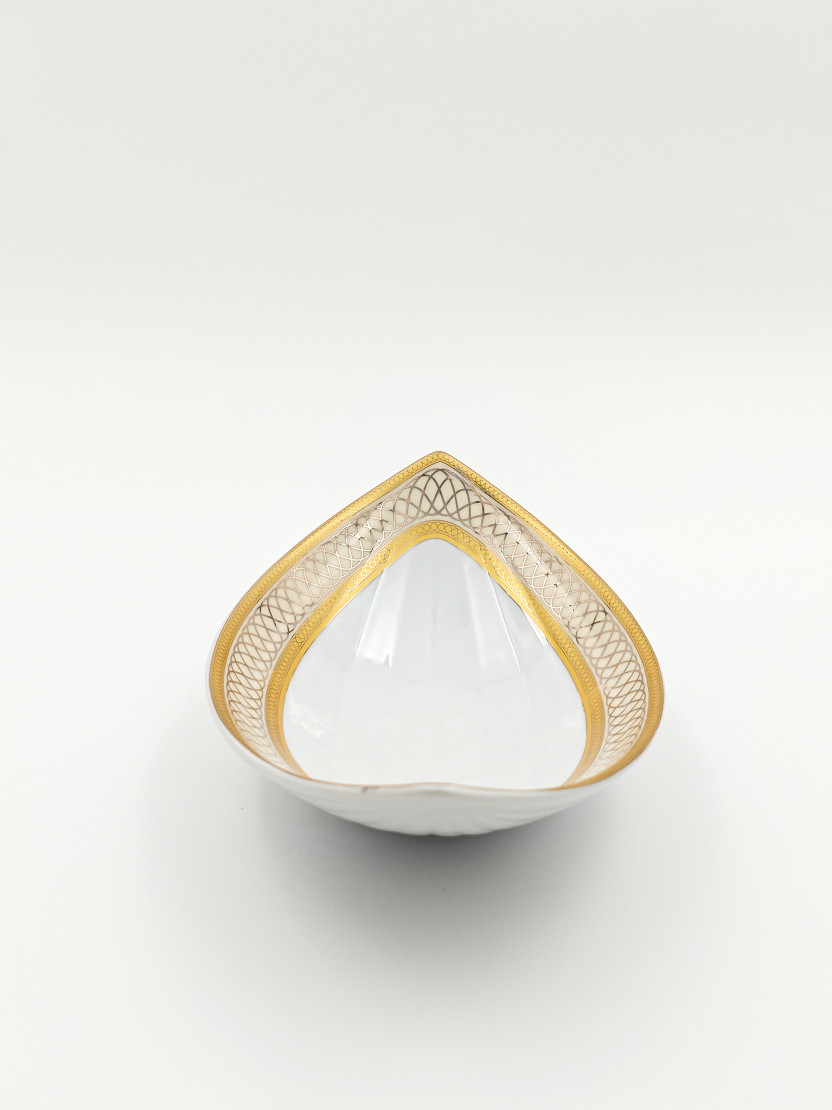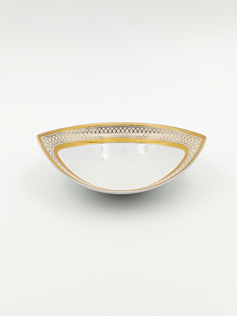 Элегантная фарфоровая арбузница оригинальной овальной формы станет роскошным дополнением сервировки вашего стола. Утонченный золотой орнамент на белом фоне подчеркивает изящество изделия, а продуманная форма идеально подойдет для подачи фруктов, ягод и десертов.