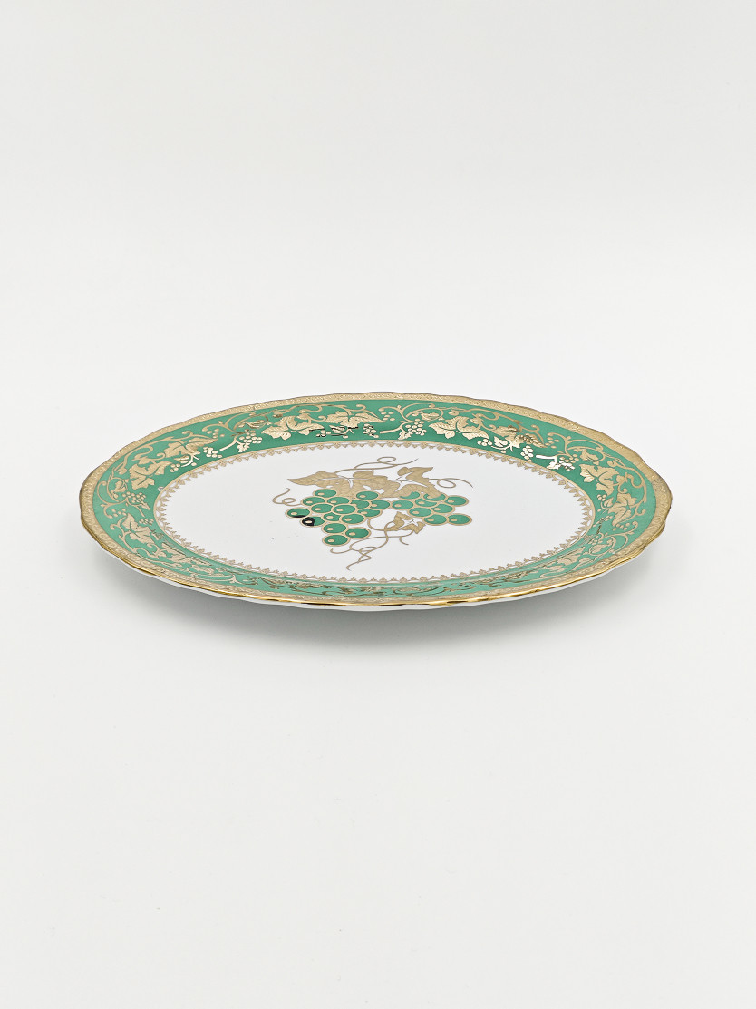 Эффектная овальная тарелка из высококачественного фарфора, декорированная роскошным золотым узором с изображением виноградной грозди на фоне изумрудного цвета. Яркий орнамент и благородные оттенки делают ее идеальным выбором для подачи закусок, десертов или основных блюд на праздничный стол.