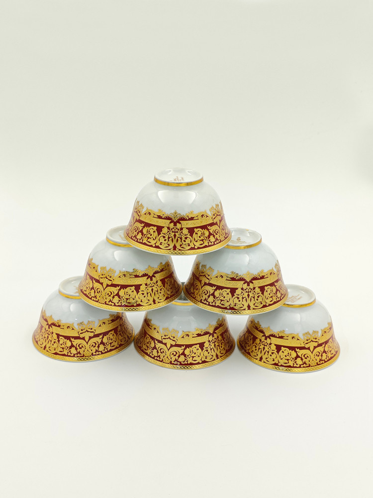 Роскошная пиала, выполненная из тонкого фарфора, украшена изысканным золотым орнаментом на глубоком бордовом фоне. Изящные узоры и золотая кайма придают изделию благородный и аристократичный вид, делая его идеальным выбором для сервировки чая, десертов или традиционных блюд.