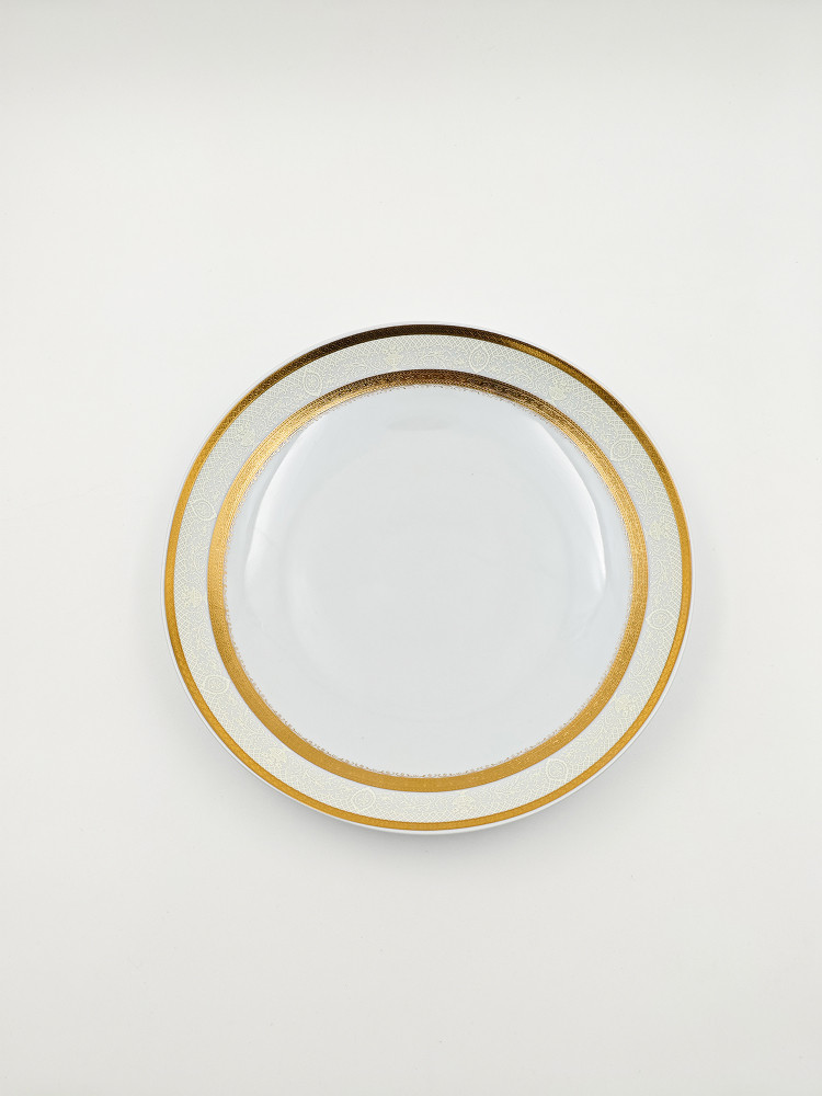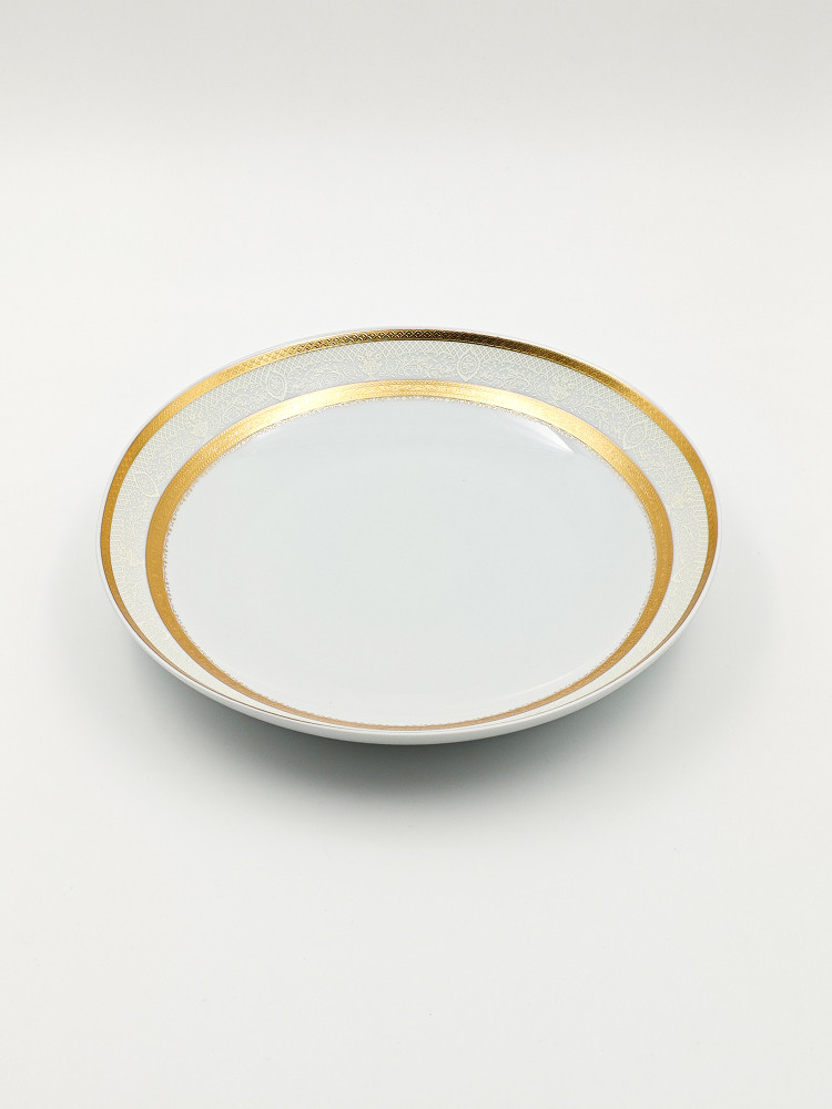 Элегантная фарфоровая тарелка с изысканным золотым орнаментом станет украшением любого стола. Ее классический дизайн и прочность делают ее идеальным выбором для торжественных ужинов и повседневного использования.