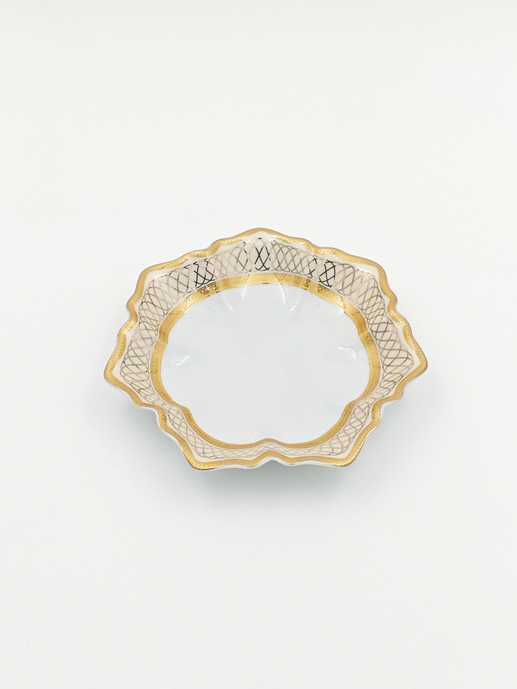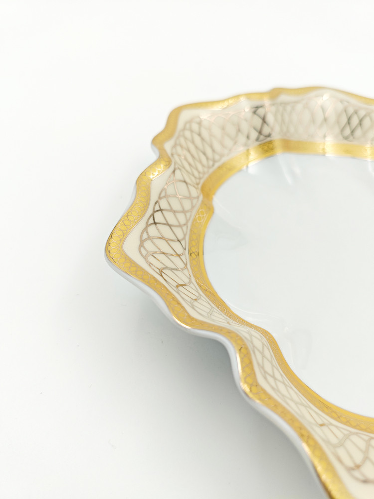 Изящное фарфоровое блюдце с волнистым краем и утонченным узором. Белоснежная поверхность украшена ажурной сеткой и широкой золотой каймой, придающей изделию роскошный и изысканный вид.
