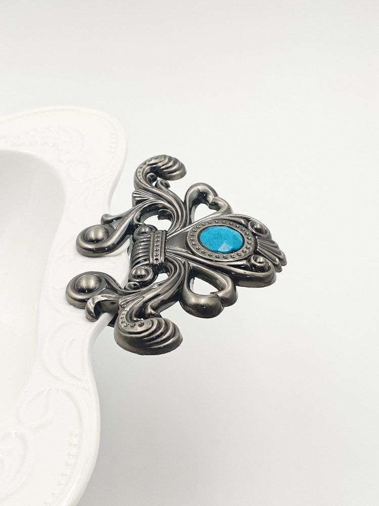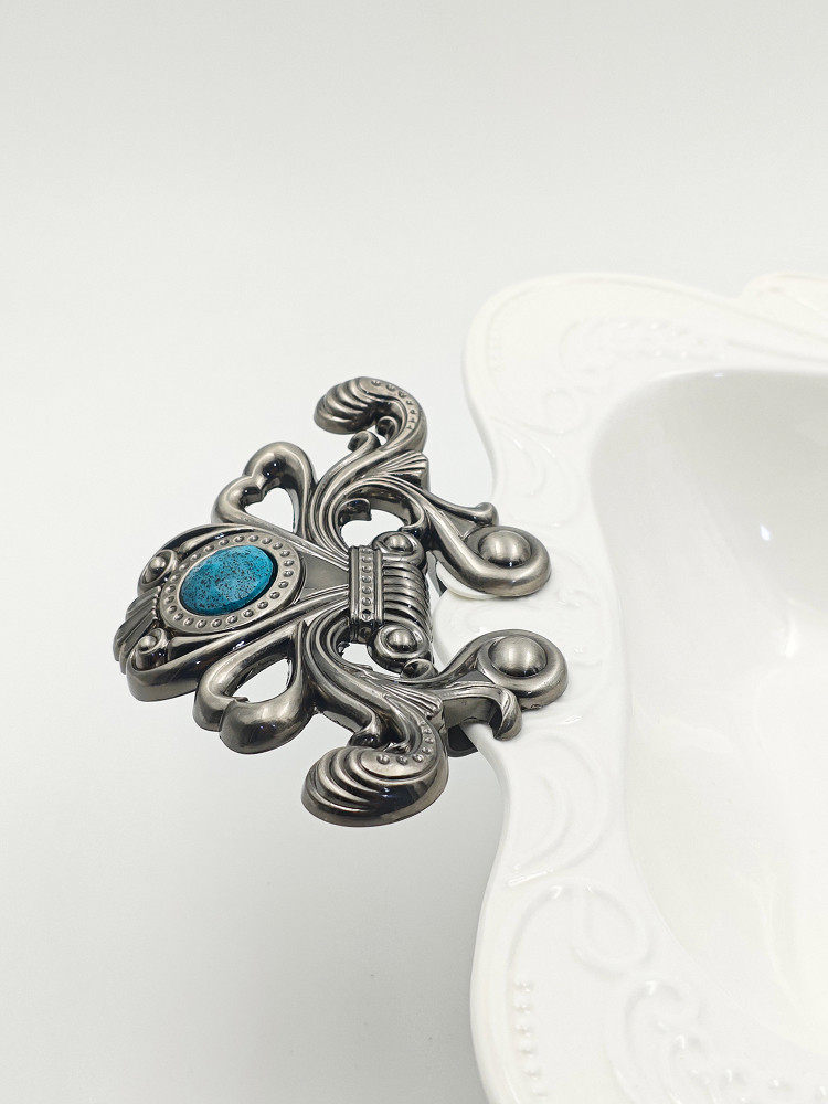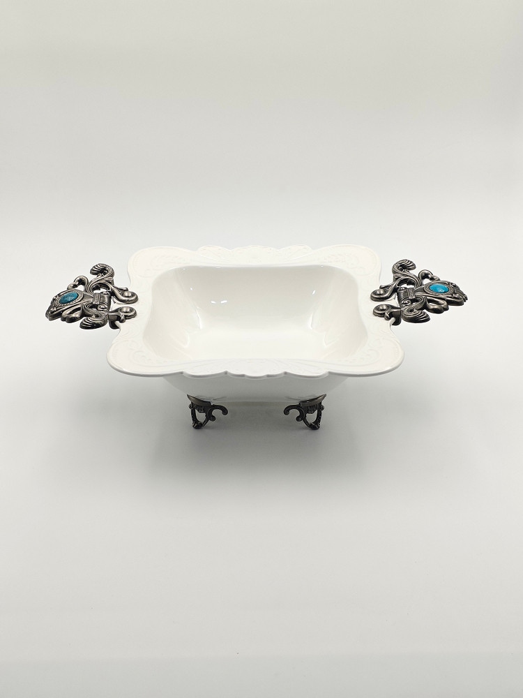 Роскошное прямоугольное блюдо из качественного белого фарфора на декоративных ножках с изысканными металлическими ручками и вставками с бирюзовыми элементами. Уникальный дизайн с рельефными узорами, утонченным металлическим декором и насыщенными бирюзовыми акцентами делает это изделие настоящим украшением стола. Подходит для подачи фруктов, сладостей, закусок и других блюд.
