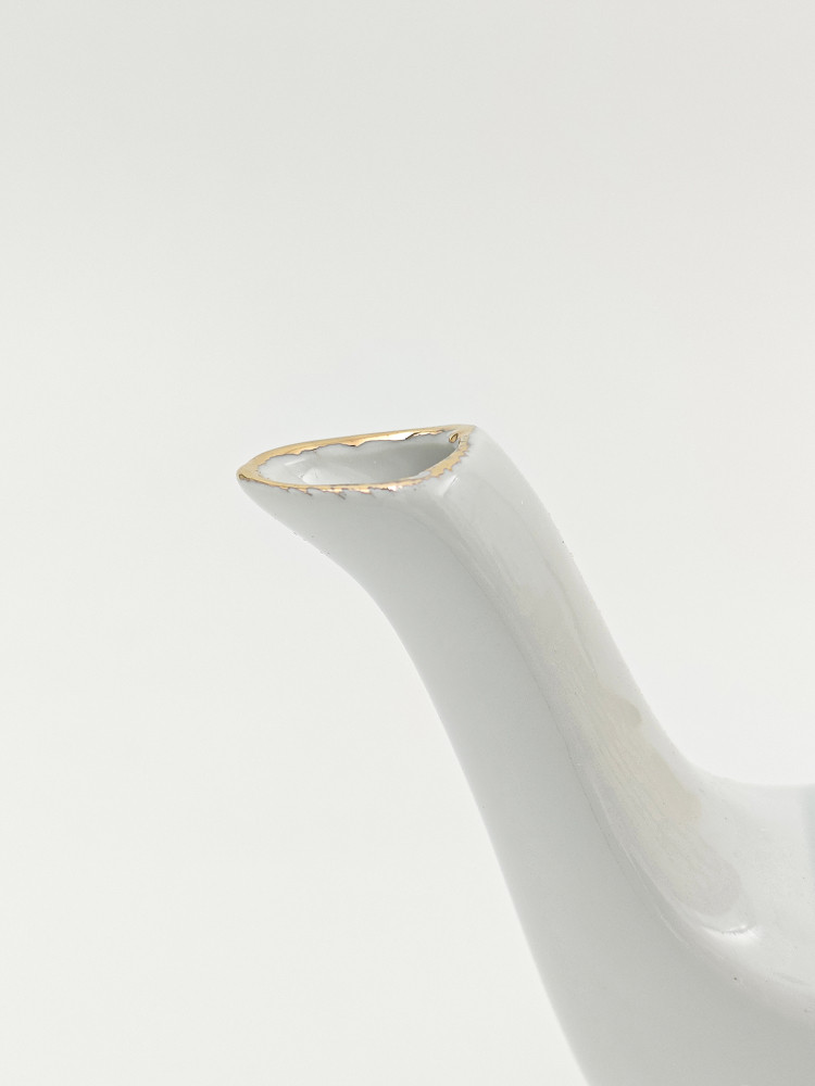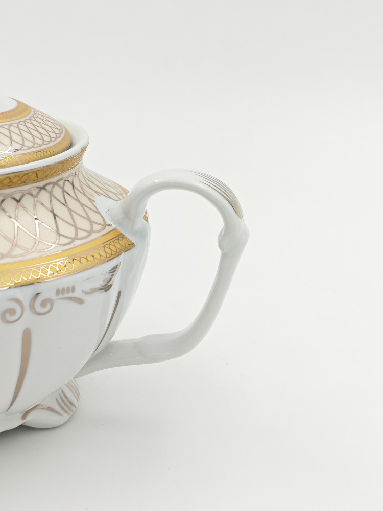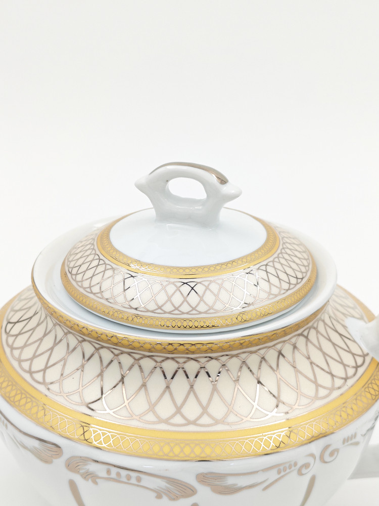Роскошный фарфоровый чайник с изысканным золотым узором. Белоснежная поверхность украшена тонкой сетчатой росписью с благородным золотым обрамлением, создавая утонченный и аристократичный стиль. Четкие линии, плавные изгибы и декоративные элементы придают ему изысканный вид.