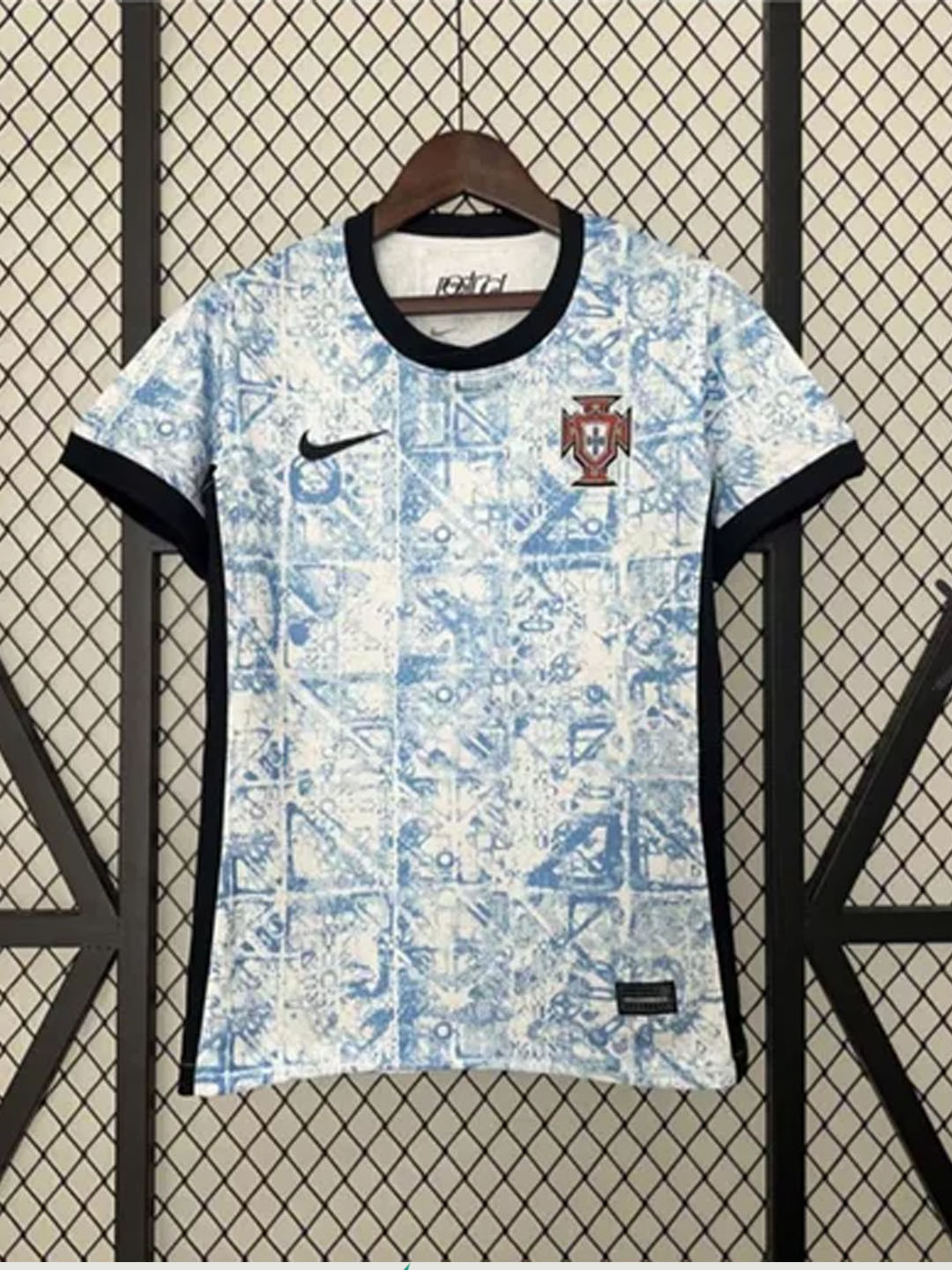 Футболка гостевой формы сборной Португалии сезона 2024. Выполнена в бело-голубой расцветке с узором, вдохновленным традиционной португальской плиткой азулежу. Черные вставки по бокам и черная окантовка воротника создают контрастный акцент. На груди расположены вышитый герб Португалии и логотип Nike. Изготовлена из легкого дышащего материала, обеспечивающего комфорт и свободу движений. Подходит для болельщиков, а также для повседневной носки и тренировок.