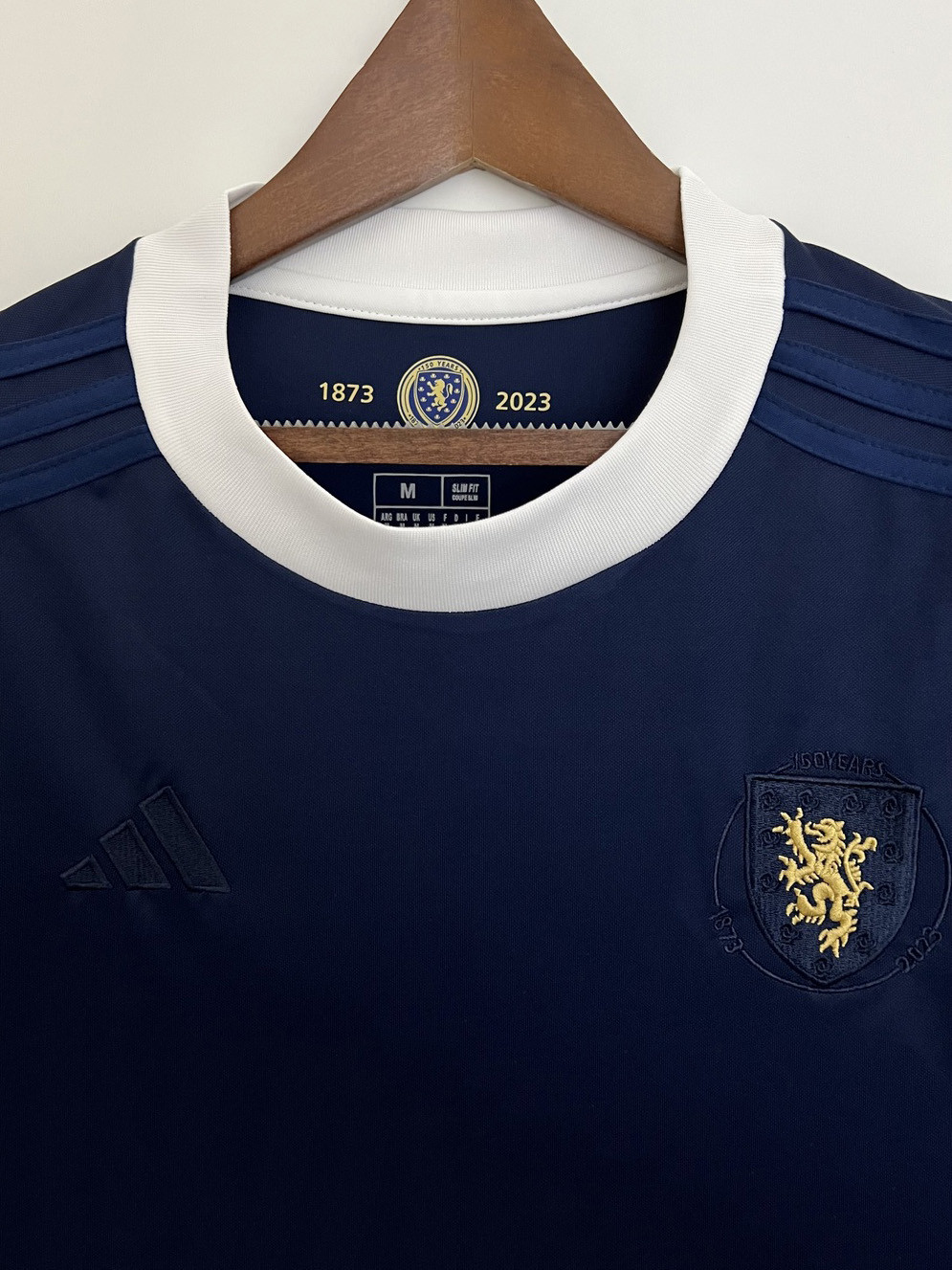 - Надпись "1873 – 2023" внутри воротника, отмечающая 150-летие первой игры национальной команды.