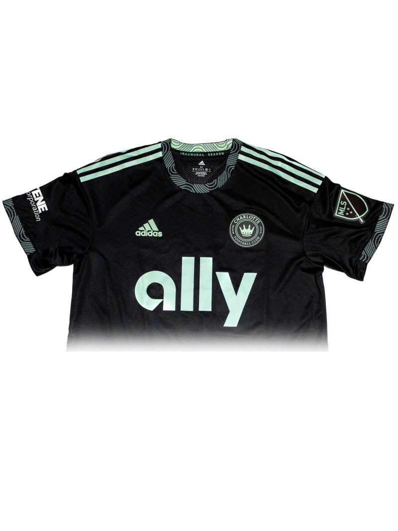 - Логотипы: Герб клуба Charlotte FC, вышитый логотип Adidas, спонсорский принт "ally" на груди.