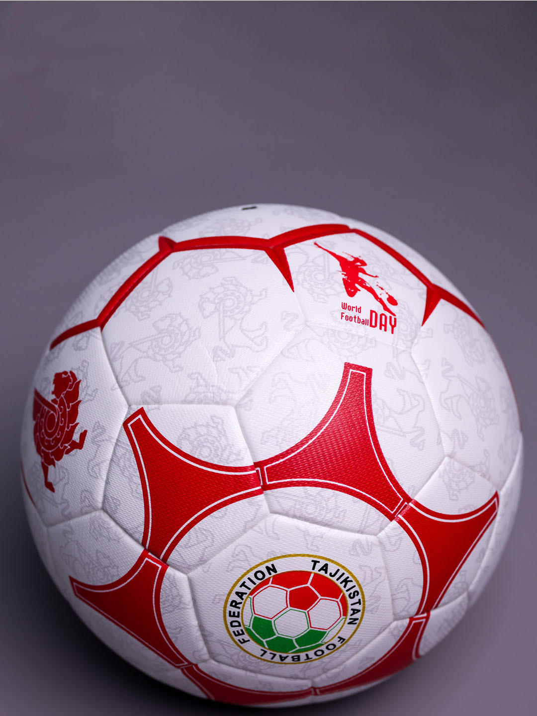 Официальный футбольный мяч Федерации футбола Таджикистана, выполненный в бело-красном дизайне с элементами национальной символики.