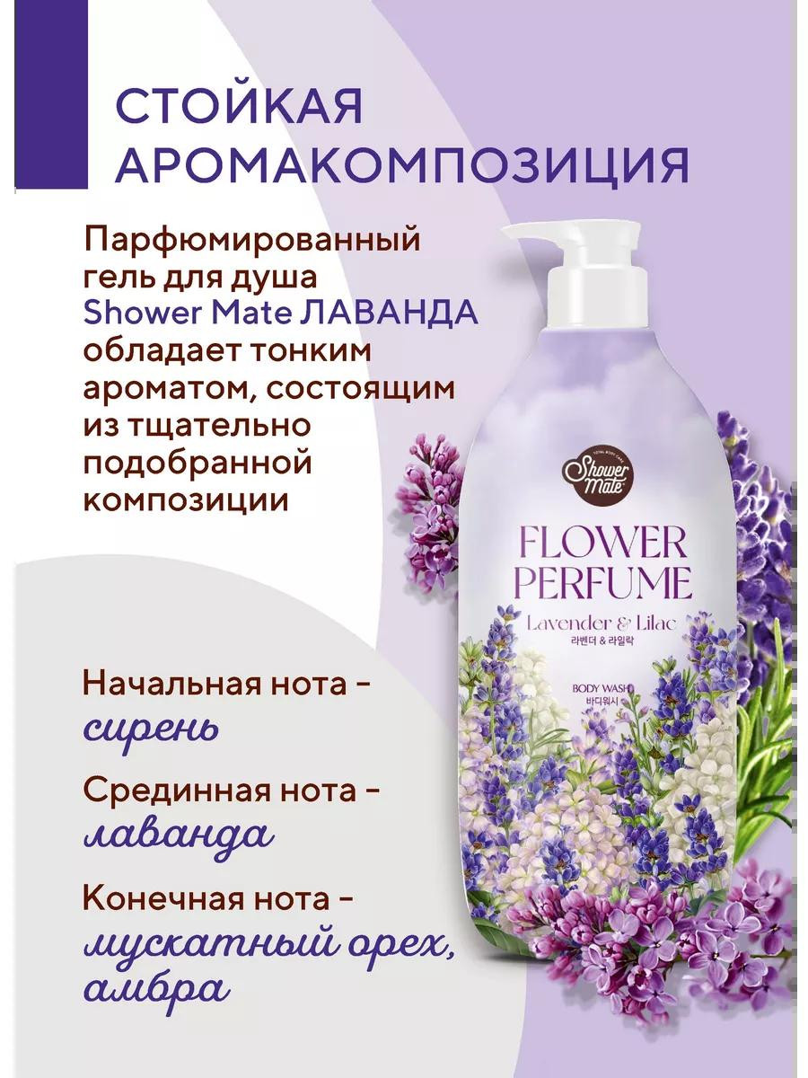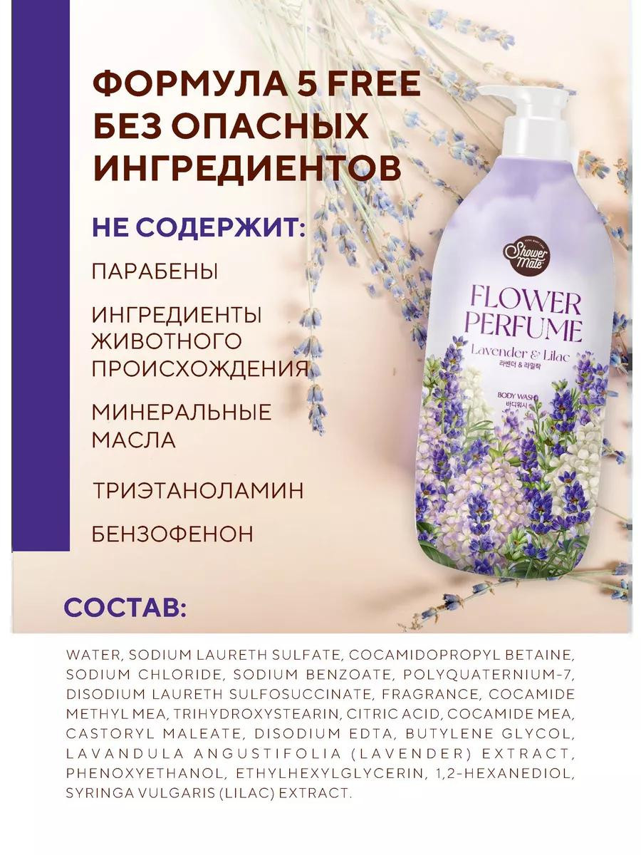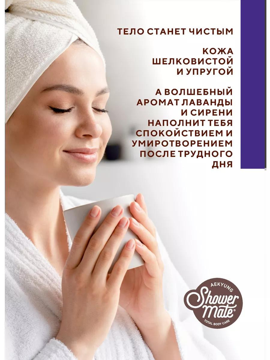 Гель обладает ароматом, состоящим из тщательно подобранной композиции, имеет нежный цветочный аромат. Начальная нота: сирень. Срединная нота: лаванда. Конечная нота: мускатный орех, амбра. Корейское Бьюти Средство содержит экстракт лаванды, который обладает успокаивающим и расслабляющим действиями, и экстракт сирени, который увлажняет и смягчает кожу.Начните свое утро с нежного цветочного аромата сирени, который пробудит в вас ощущение легкости и хорошего настроения. Затем погрузитесь в мир лаванды который успокоит вас и придаст умиротворения на весь день. А завершит ваше путешествие по ароматам мускатный орех, придающий глубину и теплоту, и амбра, добавляющий нотку загадочности. Аромат - это только одно из преимуществ этого геля для душа, гель обладает превосходным увлажняющим эффектом, который поможет сохранить вашу кожу мягкой и упругой. Лаванда, известная как королева трав, эффективно успокаивает и также расслабляет кожу. Способствует глубокому расслаблению и снятию мышечных микро-блоков, что приводит к разглаживанию морщинок и общей релаксации организма, лаванда также обладает бактерицидным, ранозаживляющим и смягчающим действием. Формула геля Shower Mate разработана без опасных ингредиентов, таких как парабены, ингредиенты животного происхождения, минеральные масла, триэтаноламин и бензофеноны. Вы можете быть уверены в безопасности использования продукта. Результат использования геля для душа Shower Mate впечатляет. Ваше тело станет чистым, а кожа - шелковистой и упругой. А волшебный аромат сирени и лаванды наполнит вас нежностью и любовью к новому дню. Гель для душа Shower Mate очень щадящий, поэтому подходит для всех типов кожи: сухой, зрелой, обезвоженной, подростковой, проблемной, жирной. Попробуйте парфюмированный гель для душа Shower Mate и ощутите на себе все преимущества корейской косметики