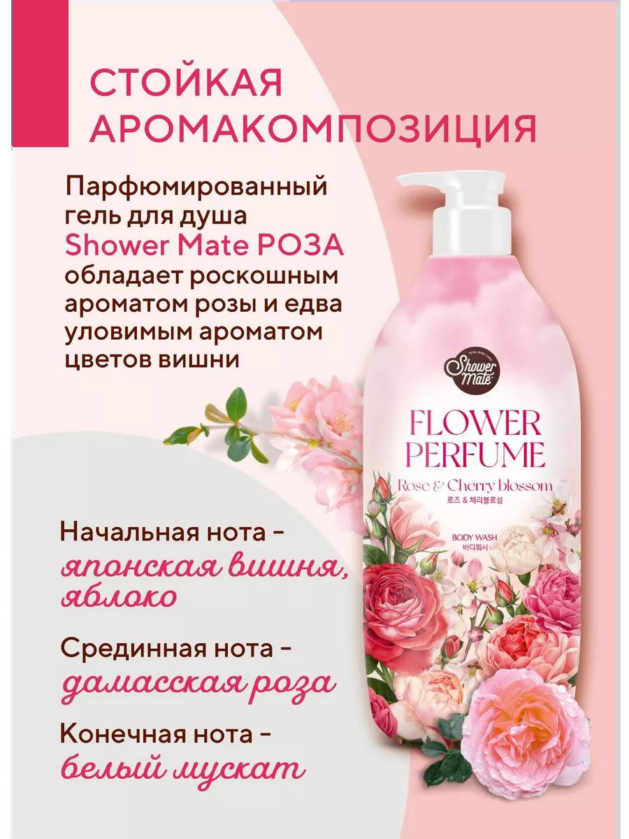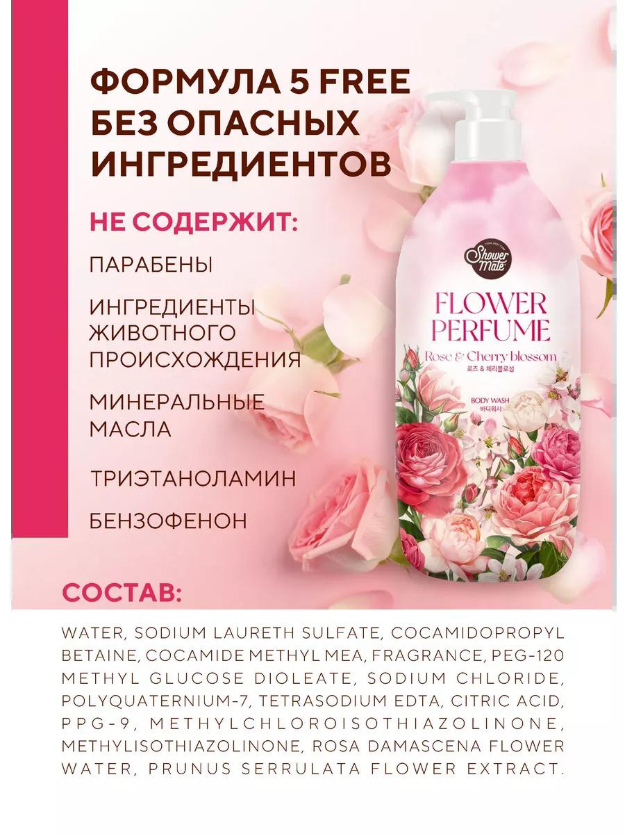 Роскошный аромат розы и едва уловимый аромат цветов вишни создают романтичное настроение и ощущение полного блаженства Верхняя нота - аромат цветов японской вишни, яблоко Средняя нота - дамасской роза Конечная нота - белый мускат Начните свое утро с нежного цветочного аромата сакуры и яблони в цвету, который пробудит в вас ощущение легкости и хорошего настроения. Затем погрузитесь в мир роз, который добавит вам энергии и свежести на весь день. А завершит ваше путешествие по ароматам белый мускат, придающий глубину и теплоту. Но аромат - это только одно из преимуществ этого геля для душа. Гель обладает превосходным увлажняющим эффектом, который поможет сохранить вашу кожу мягкой и упругой. Содержит воду цветов дамасской розы для увлажнения сухой кожи, известно, что розовая вода – уникальный источник витаминов и антиоксидантов, а дамасские розы особенно богаты витамином С. Именно поэтому этот парфюмированный и нежный Гель для душа успокаивает чувствительную кожу и способствует увлажнению. Формула геля Shower Mate разработана без опасных ингредиентов, таких как парабены, ингредиенты животного происхождения, минеральные масла, триэтаноламин и бензофеноны. Это значит, что вы можете быть уверены в безопасности использования продукта. Результат использования геля для душа Shower Mate впечатляет. Ваше тело станет чистым, а кожа - шелковистой и упругой. А аромат волшебный розы и цветущей сакуры наполнит вас нежностью и любовью к новому дню. Корейский Гель для душа Shower Mate очень щадящий, поэтому он подходит для всех типов кожи: проблемной, жирной. сухой. зрелой, обезвоженной.Попробуйте парфюмированный гель для душа Shower Mate и ощутите на себе все преимущества корейского ухода за кожей.