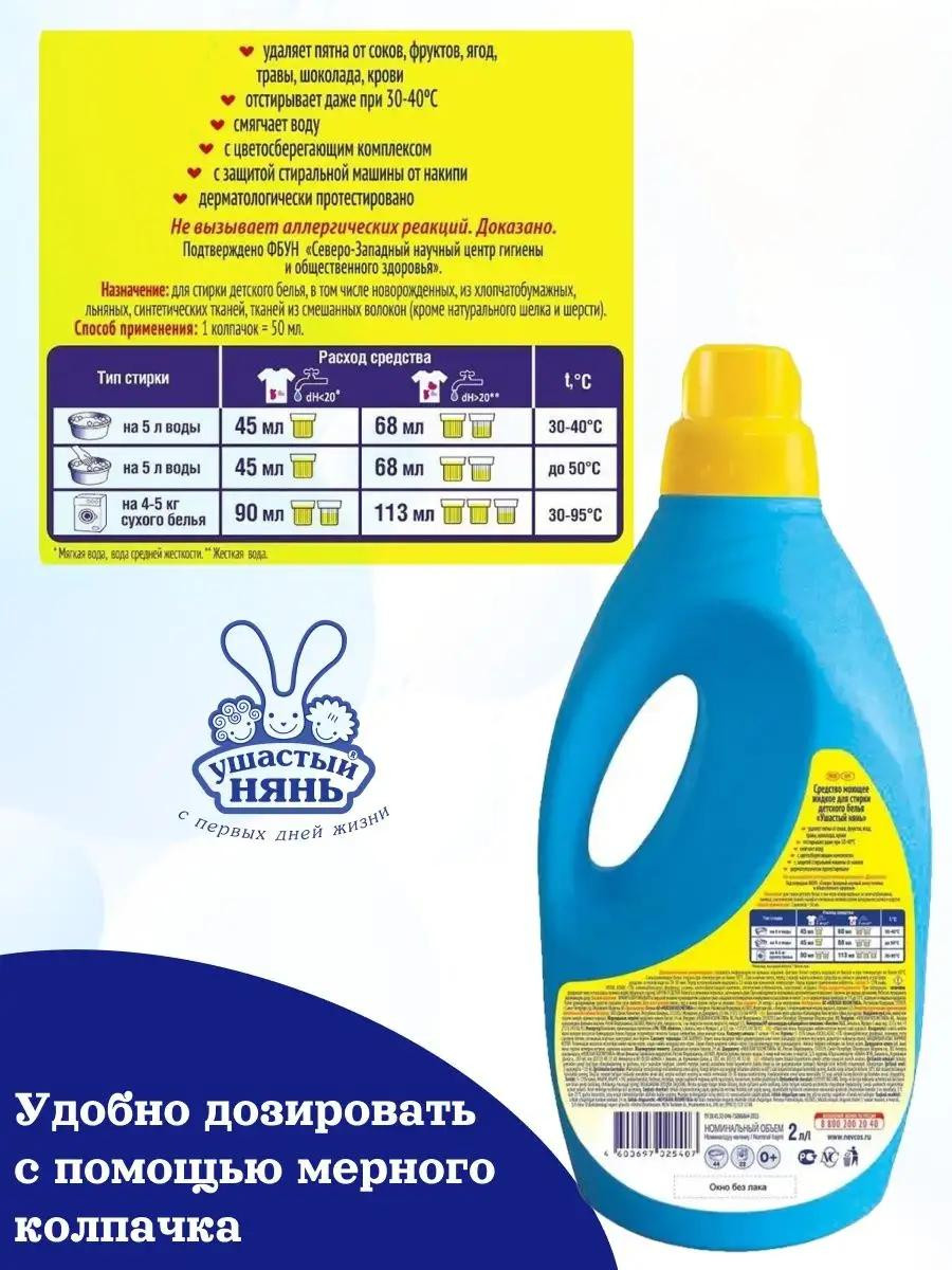 Гель для стирки под брендом "Ушастый нянь" разработан для белья и одежды детей с рождения. СМС имеет густую консистенцию, с нейтральным, легким ароматом, запах не остается на белье после использования. Средство для стирки детского УН отлично отстирывает специфические детские загрязнения и сложные пятна, полностью растворяется, даже при низкой температуре, и полностью выполаскивается из тканей, облегчает глажение, оказывает антистатический эффект. Детский порошок сохраняет цвет и структуру волокон, предотвращает потерю формы одежды даже после многократных стирок. Жидкий детский порошок Ушастый Нянь хорошо пенится, подходит для всех типов стиральных машин и для ручной стирки. Порошок стиральный автомат имеет эффективную безопасную формулу, может быть использован для стирки одежды людей с чувствительной кожей, рекомендован для детей, склонных к аллергии. Гелеобразный порошок - Особенности: - не содержит мыла, поэтому легко и полностью выполаскивается из ткани, не оставляя на ней ни моющих веществ, ни запаха, что исключает появление аллергических реакций; - начинает действовать уже в процессе замачивания и удаляет загрязнения в воде низкой температуры; - массовая доля пыли в стиральном порошке составляет не более 0,7% Перед использованием гель рекомендуем взбалтывать. Порошок Ушастик -аналог таких средств для стирки как капсулы, гели и пластины для стирки. Упаковка порошок 6кг и 9кг порошка экономичнее других фасовок порошко.в Не уступит в эффективности брендам BioMio, Synergetic, Аистенок !