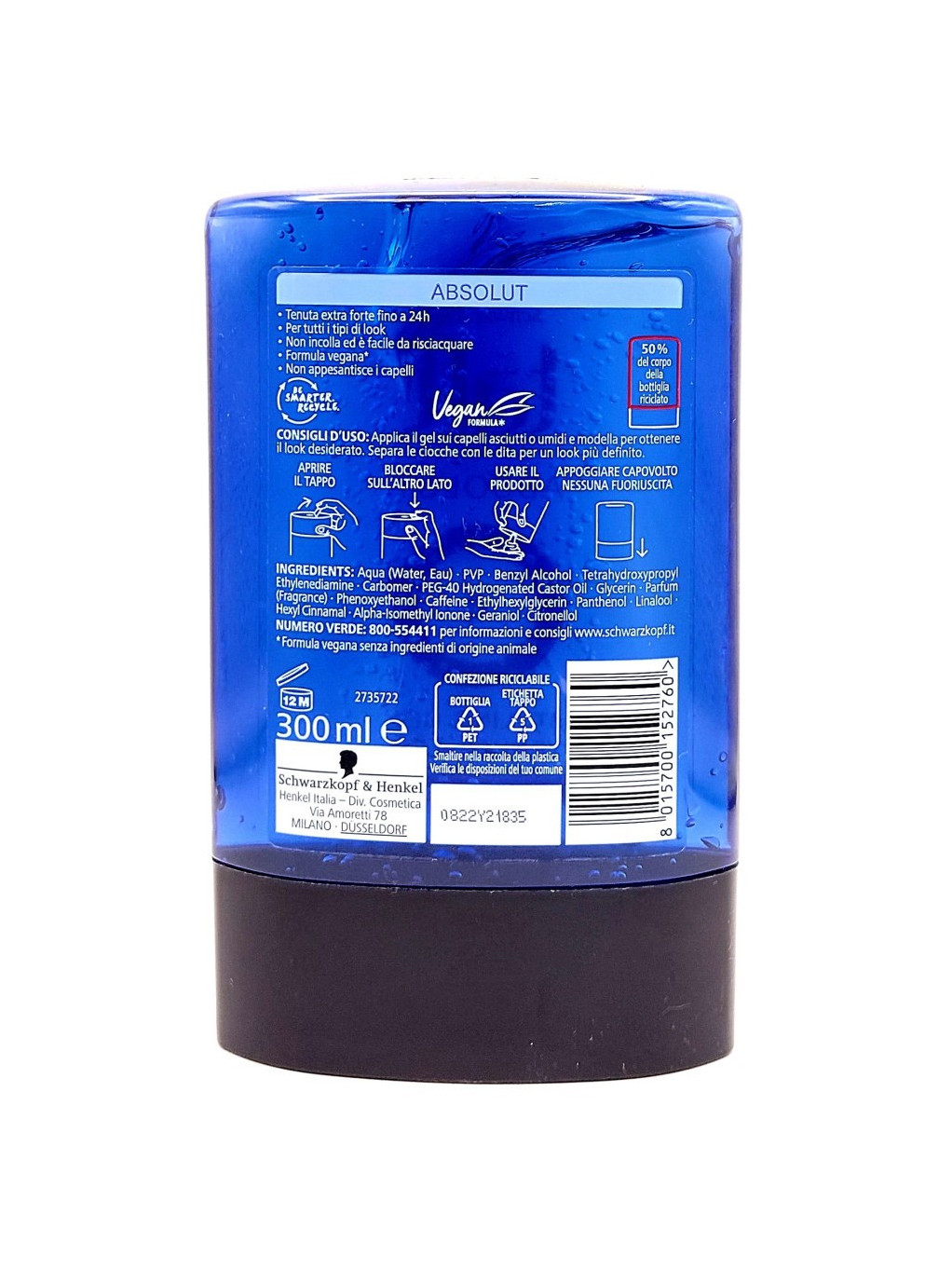 Schwarzkopf Taft Absolut Styling Gel - это гель для волос экстрасильной фиксации, который обеспечивает надежный контроль и стойкость вашей прически в течение 24 часов. Идеально подходит для создания четких, структурированных укладок и придания волосам дополнительного объема без склеивания и ощущения липкости.