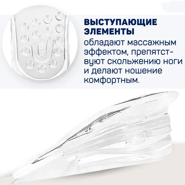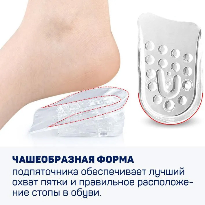 Прозрачные силиконовые подпяточники, увеличивающие рост на 2.5 см, обладают всеми эффектами ортопедических приспособлений для защиты пятки: