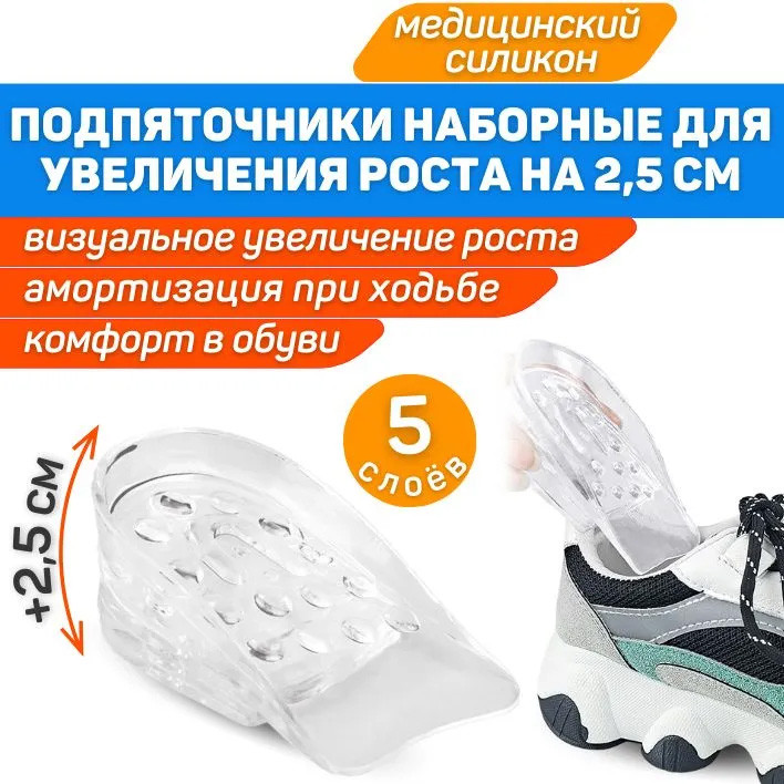 Именно для этого были созданы наборные силиконовые подпяточники для увеличения роста. Изделия помогают быстро увеличить рост до 2.5 см.