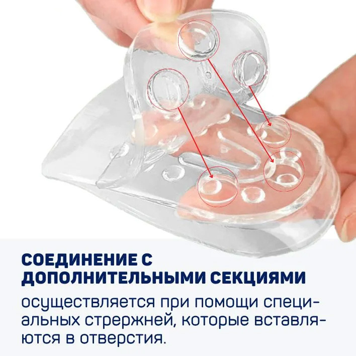Отличительная особенность этих подпяточников - наборность. В комплект входят 2 подпяточника (для левой и правой ноги) и 8 доборных элементов (по 4 на каждую ногу). Толщина самого подпяточника составляет 0.5 см, а каждый наборный слой добавляет еще + 0.5 см к росту. Таким образом, используя силиконовые подпяточники для роста, вы можете «подрасти» на 0.5, 1, 1.5, 2 или 2.5 см.
