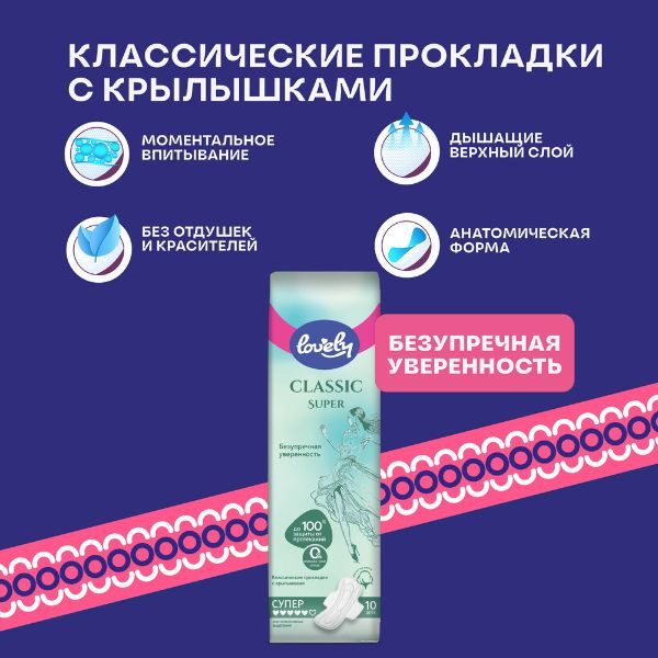 Классические женские гигиенические прокладки LOVELY Classic Super быстро впитывают, превращая жидкость в гель. Надежно защищают от протеканий обеспечивая вам уверенность в каждом движении на протяжении всего дня. Мягкая поверхность из натурального материала позаботится о вашей коже и не вызовет аллергических реакций. LOVELY - Забота с любовью.