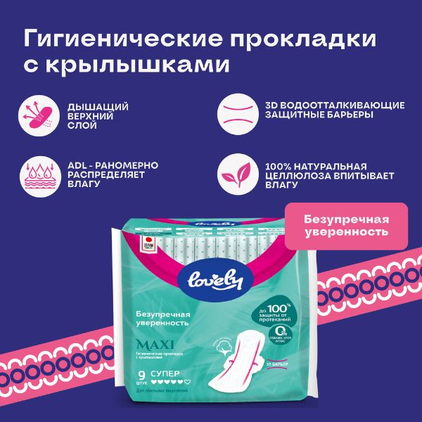 Прокладки японского качества LOVELY Maxi Super с широкими крылышками защитят от протеканий. Анатомическая форма и мягкий как хлопок верхний слой позволят коже дышать. Подходят для нормальных и обильных выделений, быстро впитывают и удерживают влагу и запах внутри. Lovely - забота с любовью.