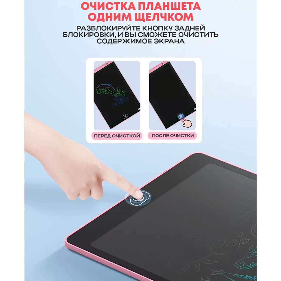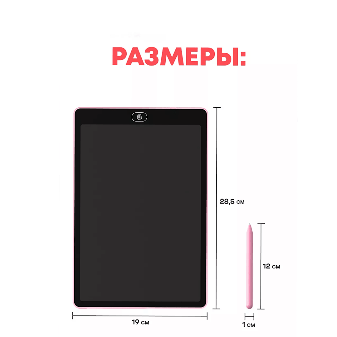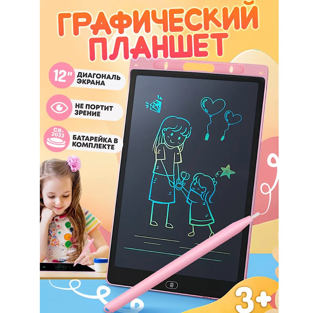 Графический планшет для заметок и рисования LCD Writing Tablet 12 дюймов подойдет как детям так и взрослым. Рисовать и писать можно где угодно, так как планшету не требуется подключение к сети или компьютеру. Планшет для рисования, это прекрасный инструмент как для тренировки, так и для создания настоящих шедевров. Всегда включенный экран, расходует энергию только на стирание - пишите, рисуйте, медитируйте, оставляйте заметки без ограничений! Экран имеет компактные размеры и легкий вес, его можно всегда взять с собой куда бы вы не пошли. Удобная альтернатива альбомам, блокнотам, липким заметкам и другим средствам для записей и рисования. Незаменим для малышей, которые только учатся рисовать, так как сбережёт ваше время и деньги на замену раскрашенных стен и мебели. А главное, не наносит вред зрению, безопасен в применении, развивает мелкую моторику, творчество и мышление, экономит время и деньги.